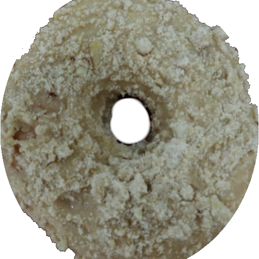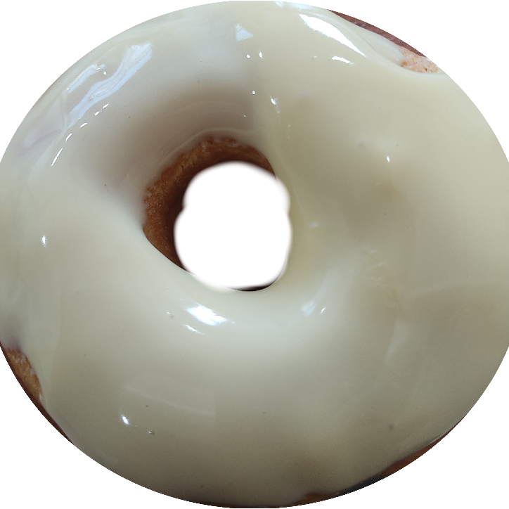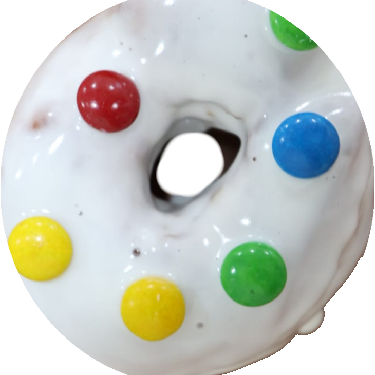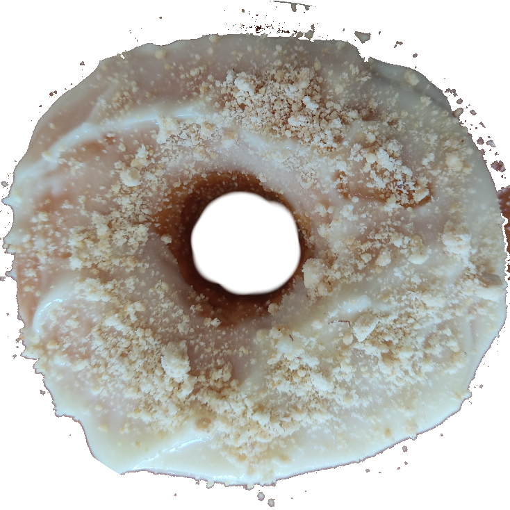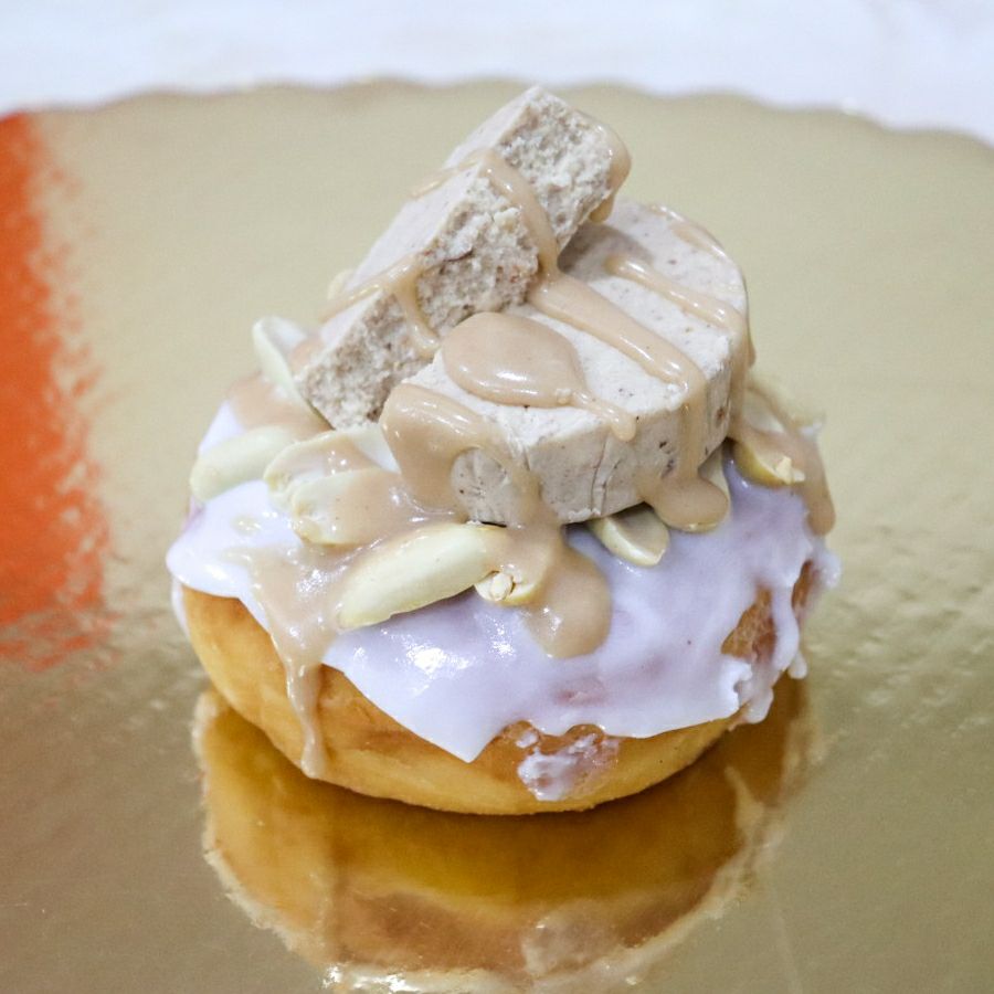 Dona cubierta con glaseado de vainilla, trozos de cacahuate, decorada con Mazapán y líneas de glaseado de crema de cacahuate