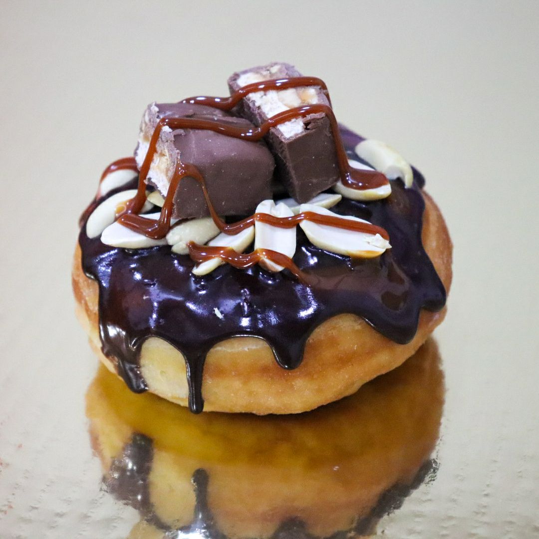 Dona cubierta con glaseado de chocolate, cacahuates, decorada con trozos de chocolate Snickers y líneas de caramelo.