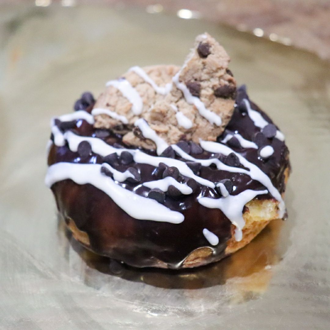 Dona cubierta con glaseado de chocolate, con chispas de chocolate, decorada con galletas de chispas de chocolate y líneas de glaseado de chocolate.