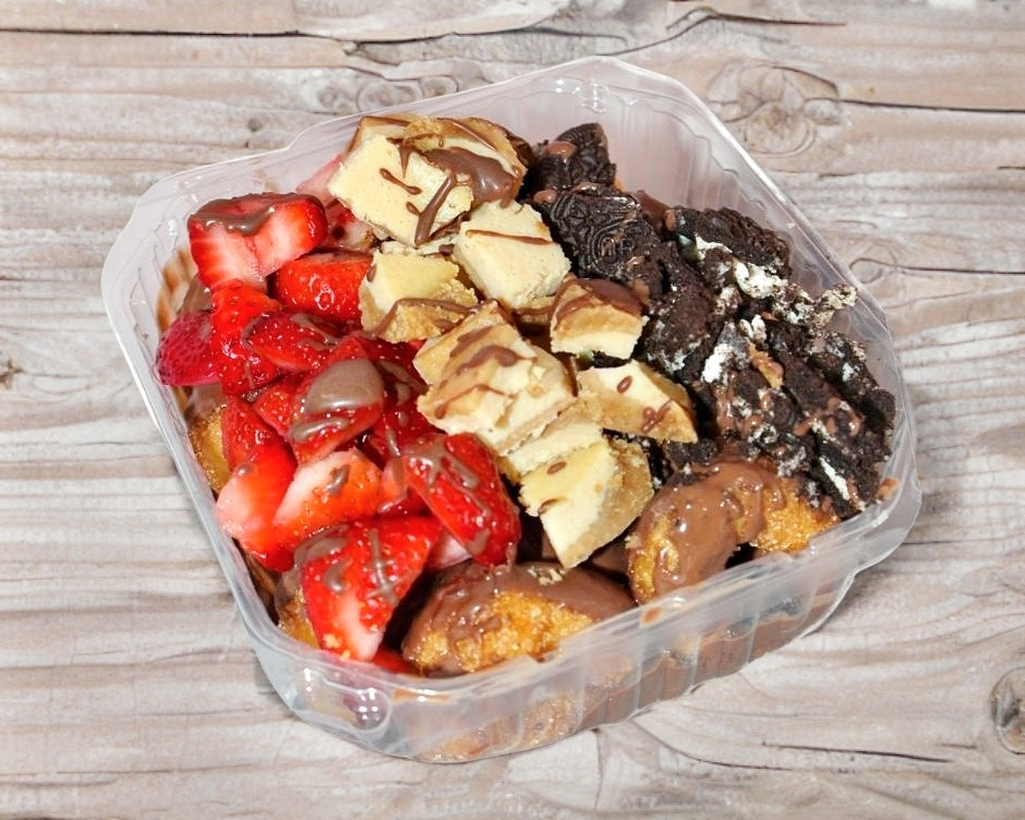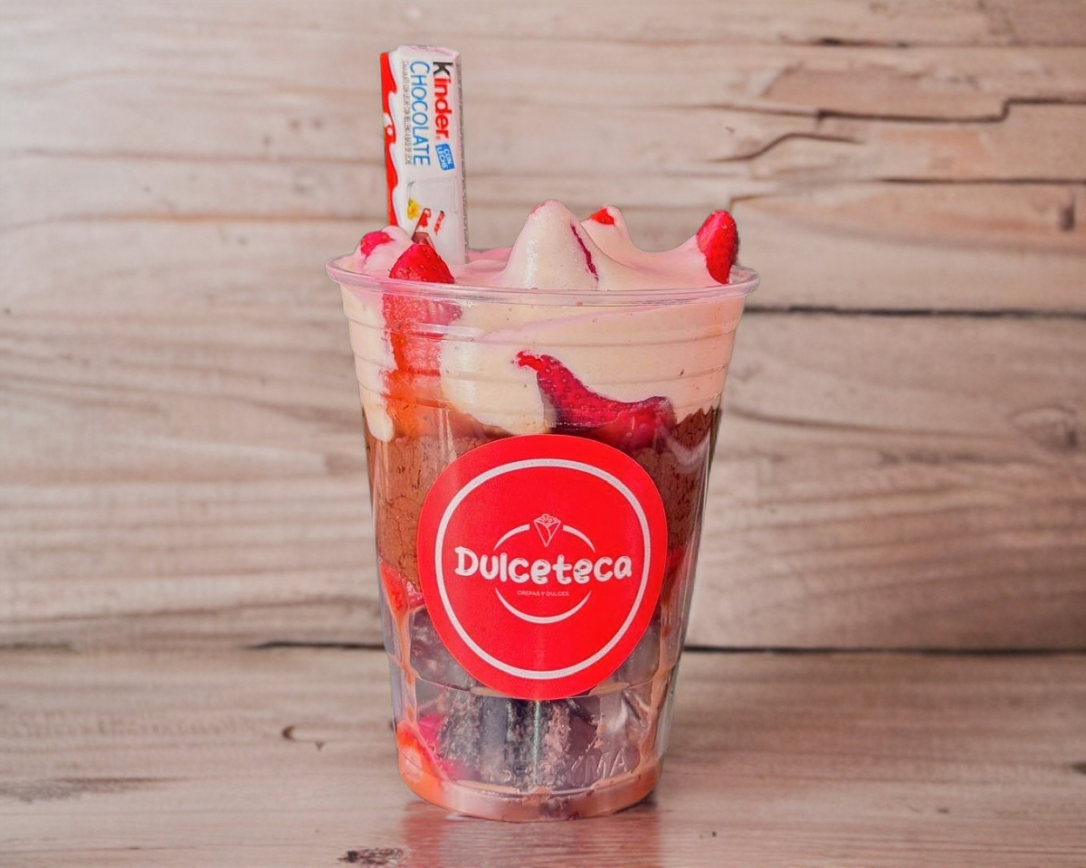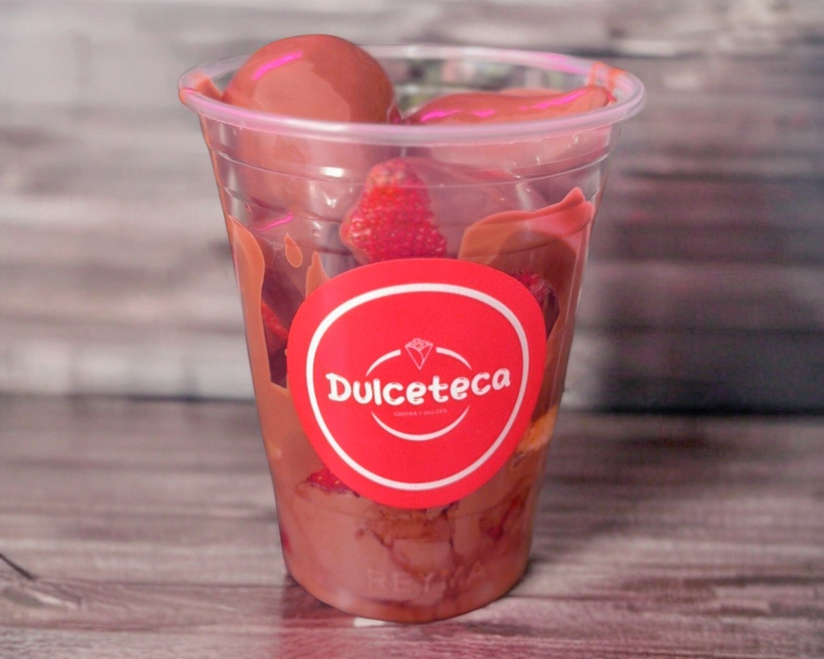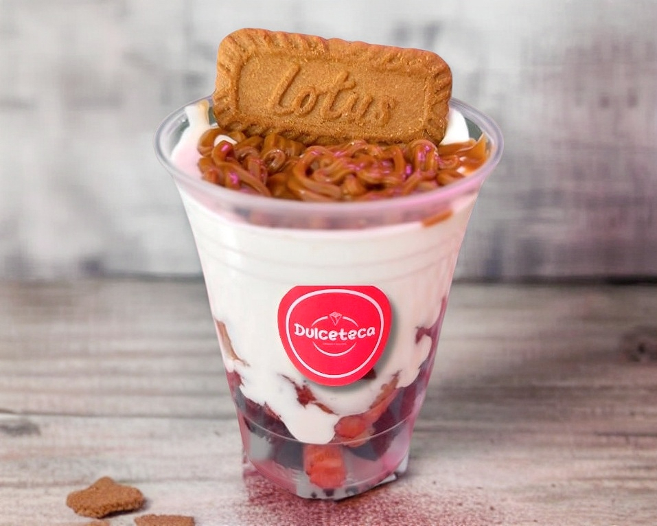 Fresas con crema, lotus (jarabe y galleta), pastelito de chocolate 16 onz