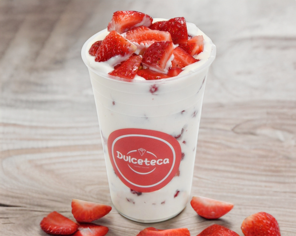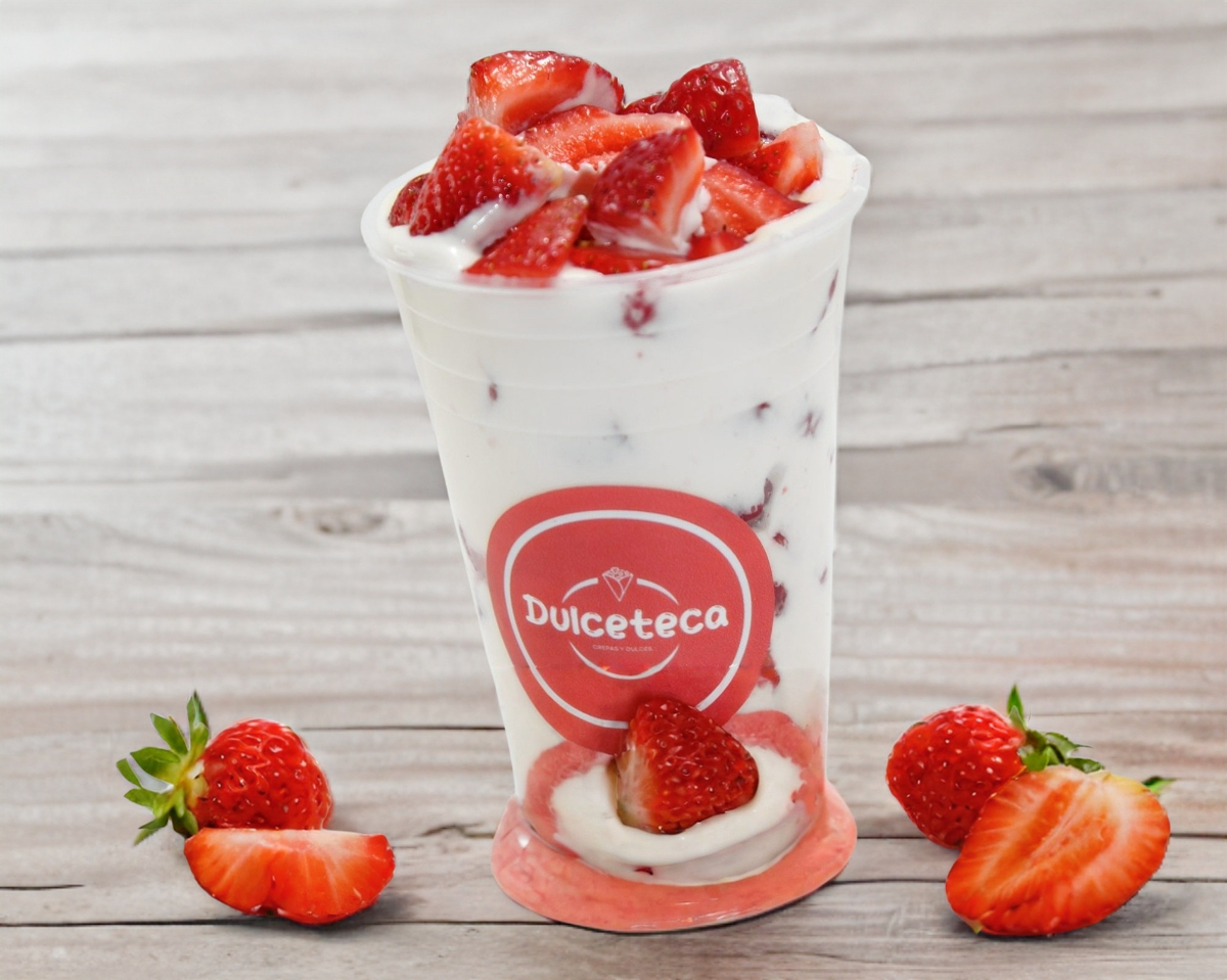 Fresas con crema sencillas, viene con un topping. (10onzas)