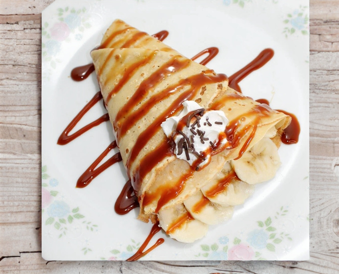 Crepa rellena de cajeta, nuez y plátano, decorada con nuez, cremax, caramelo liquido