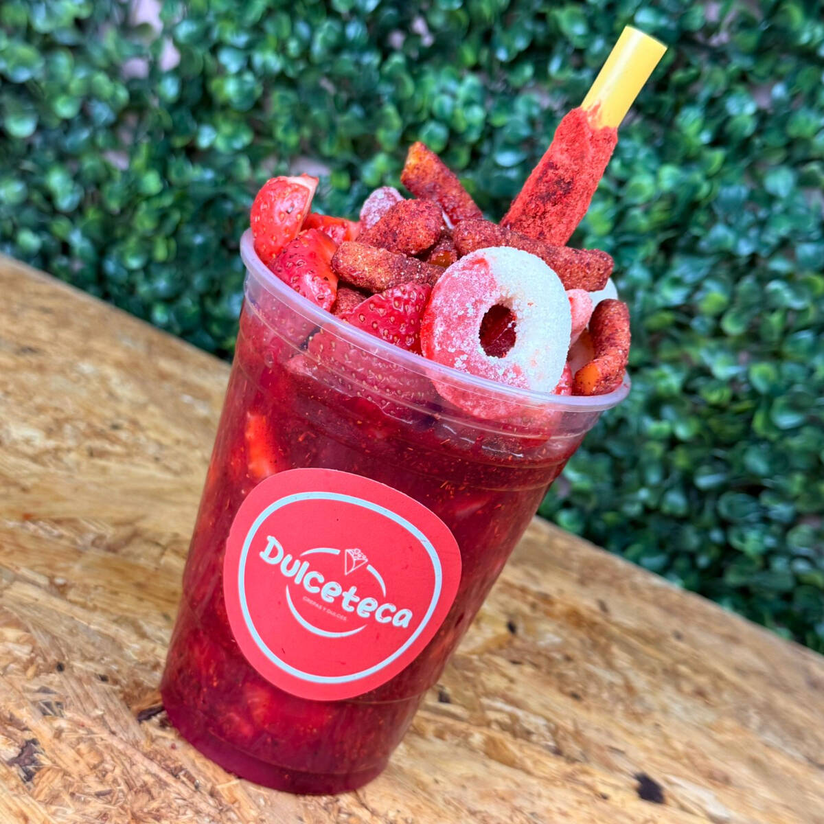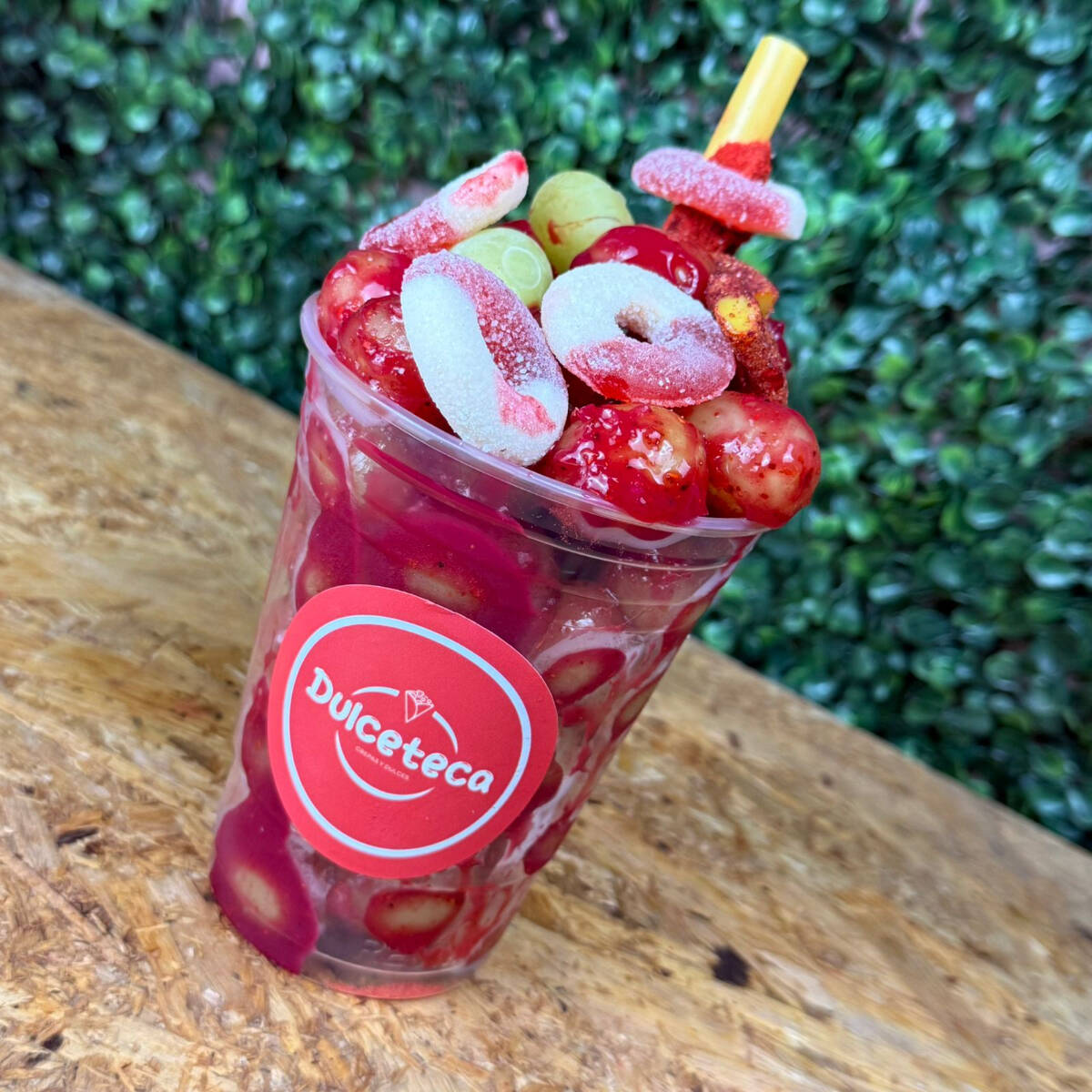 Fresas frescas con chamoy, tajín, limón, 100 gr de gomitas de tu eleccion y banderilla de tamarindo