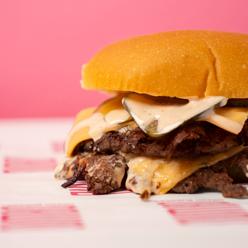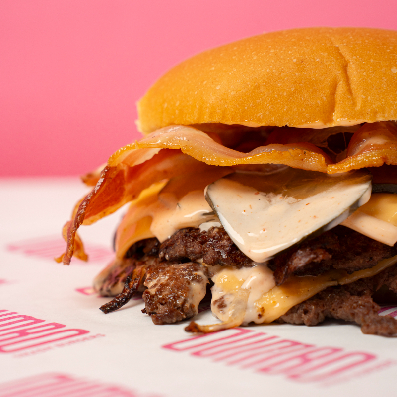 Pan de papa, doble carne, doble queso amarillo o blanco, cebolla, aderezo secreto o chipotle y tocino ahumado.