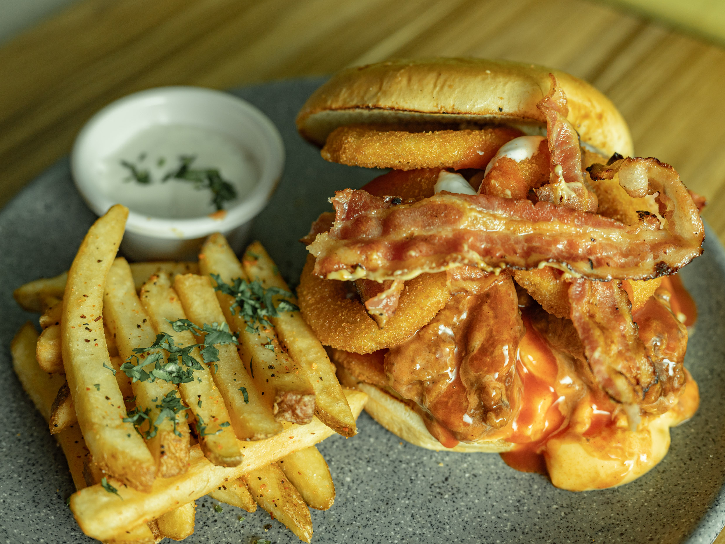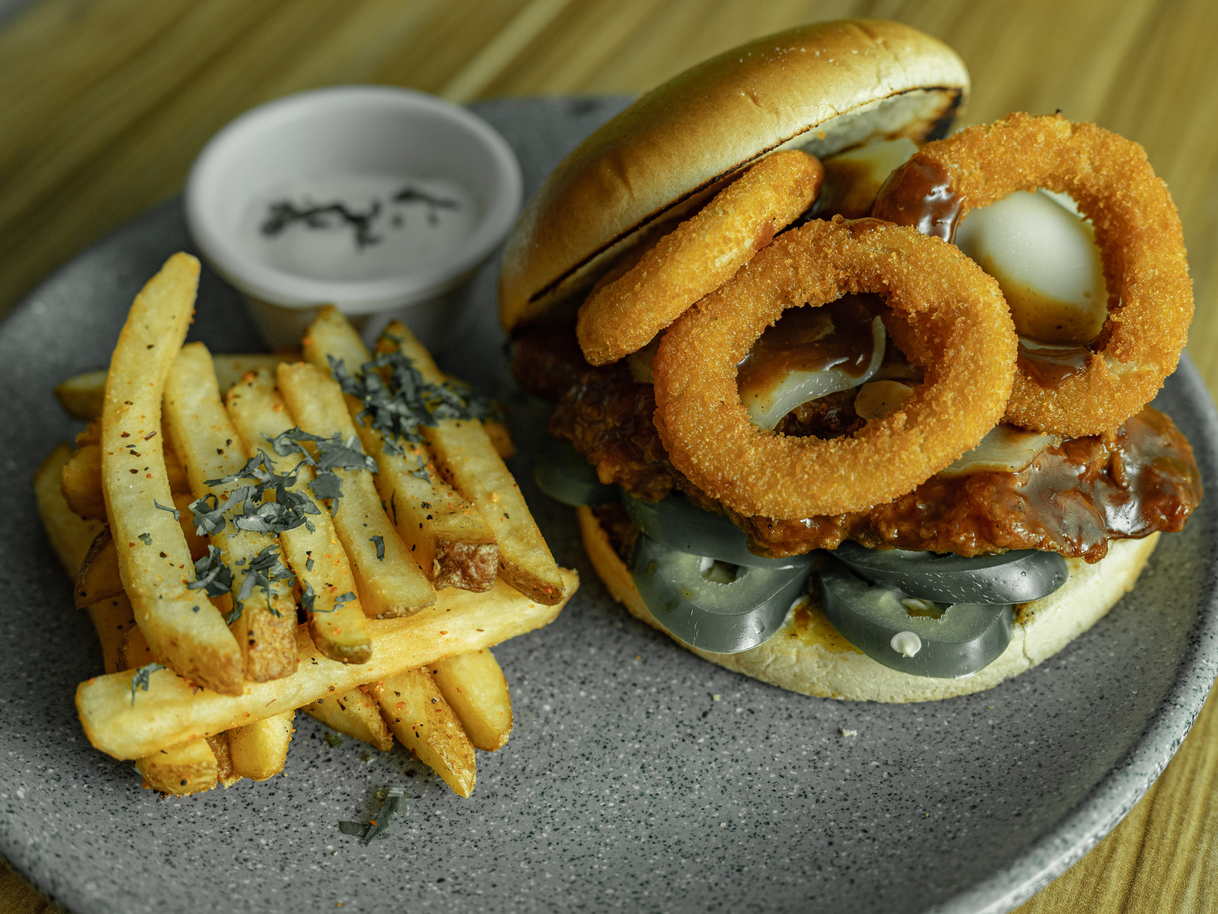 Pan artesanal brioche, pechuga de pollo fresca empanizada, queso blanco, y aros de cebolla.