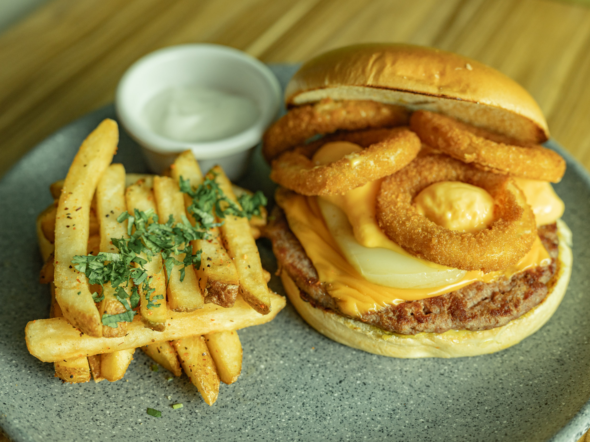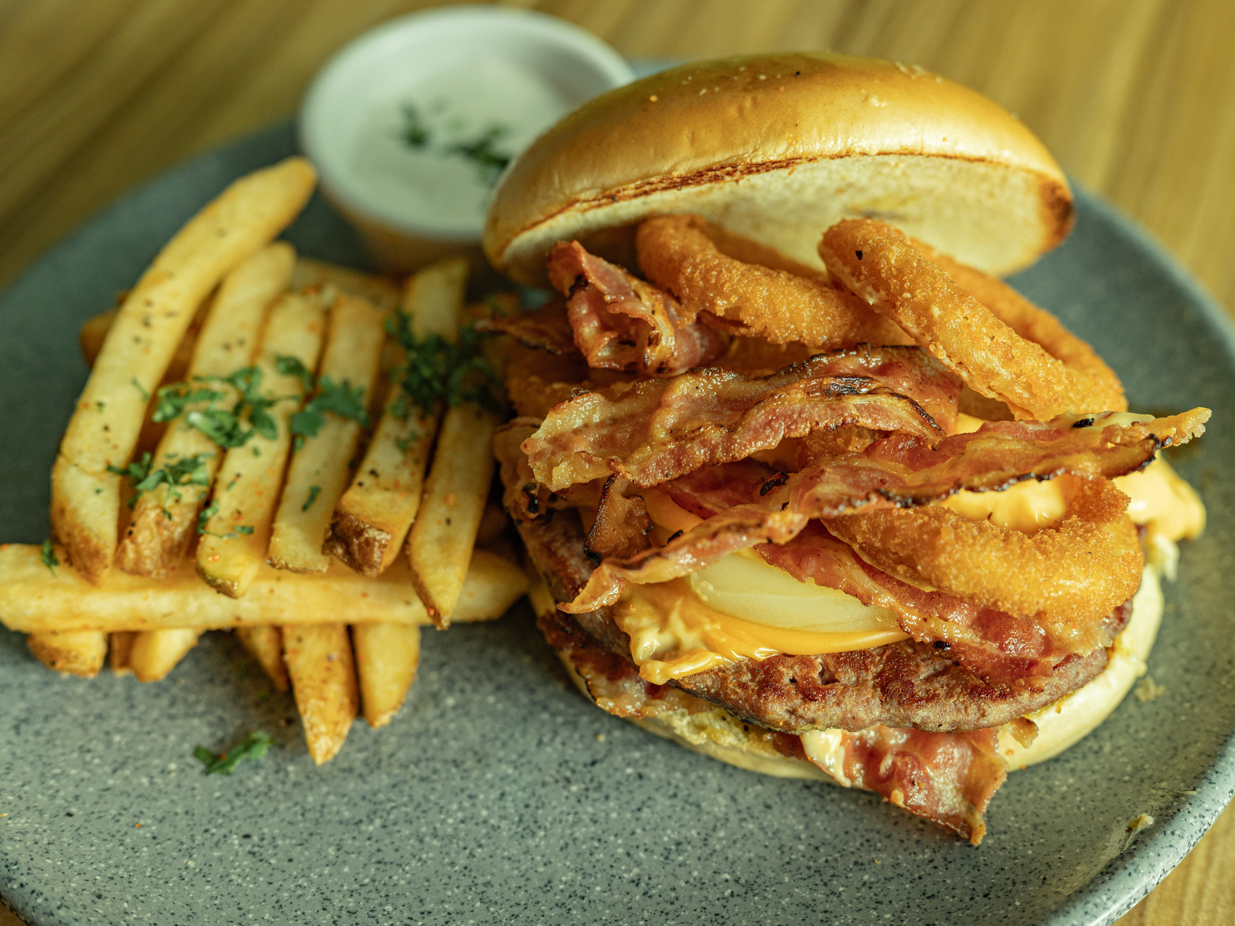 Pan artesanal brioche, carne de res a la parrilla, tocino, queso blanco, aros de cebolla, bañada en salsa BBQ.