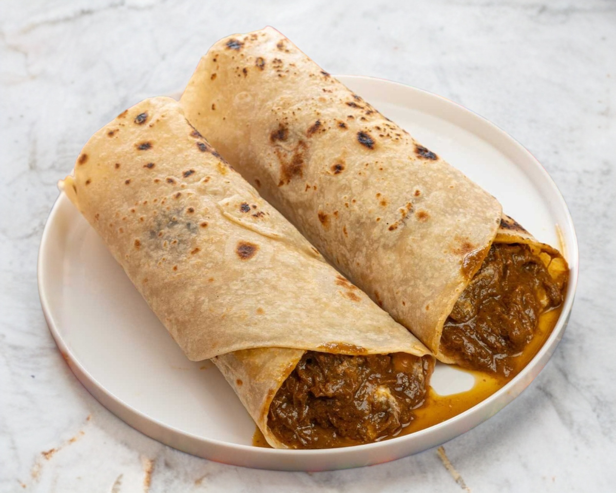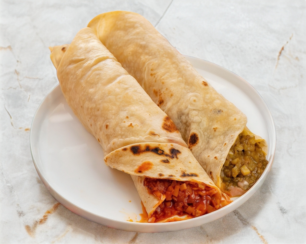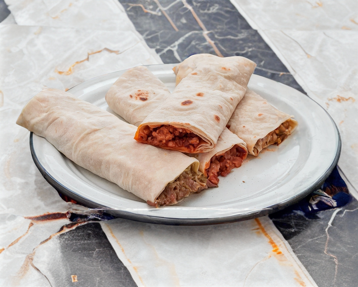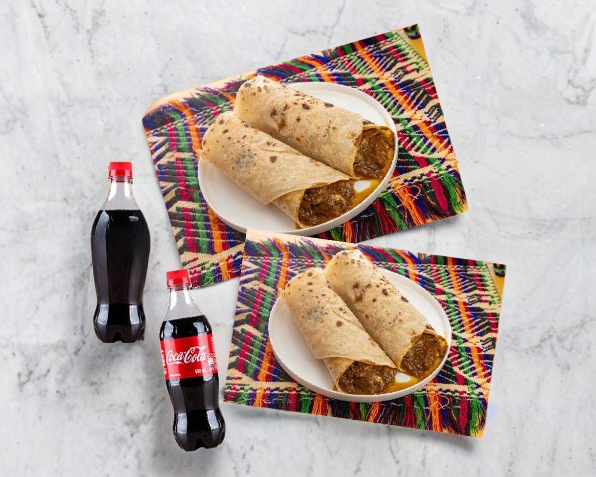 2 burros regulares con tortilla de harina de 38 cm de diámetro hechas a mano, rellenos con el guiso y acompañamientos de tu elección. Ideal para compartir (máximo 2 personas).