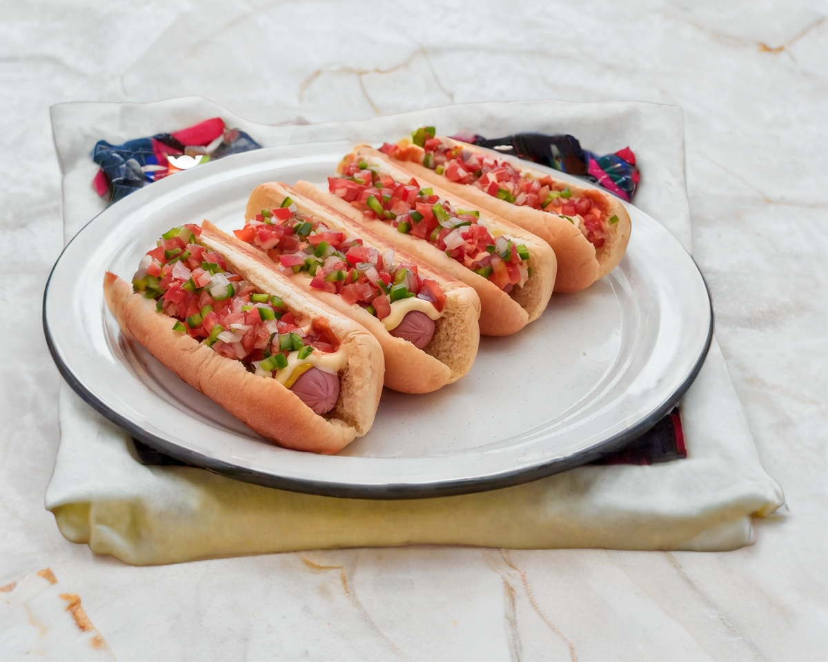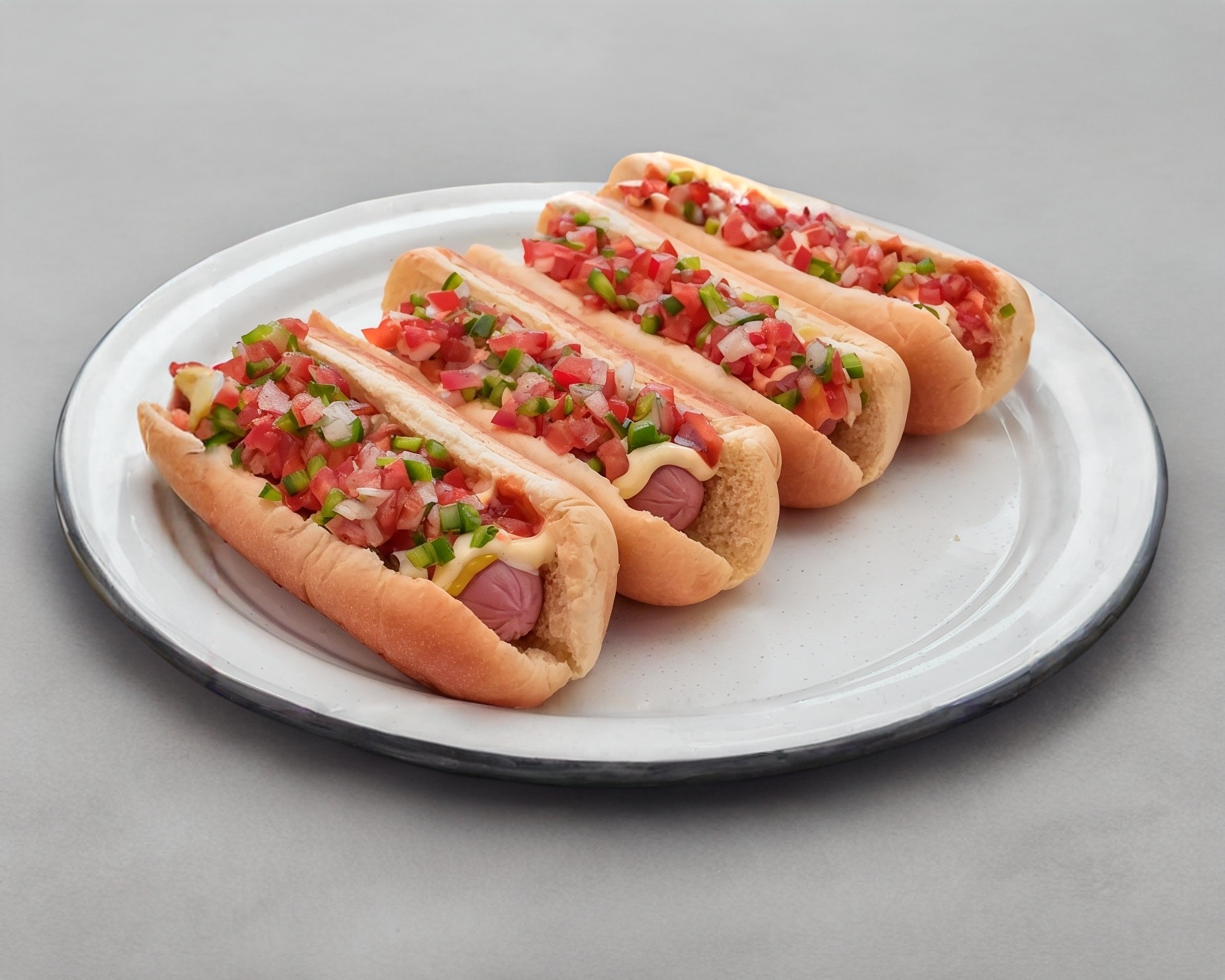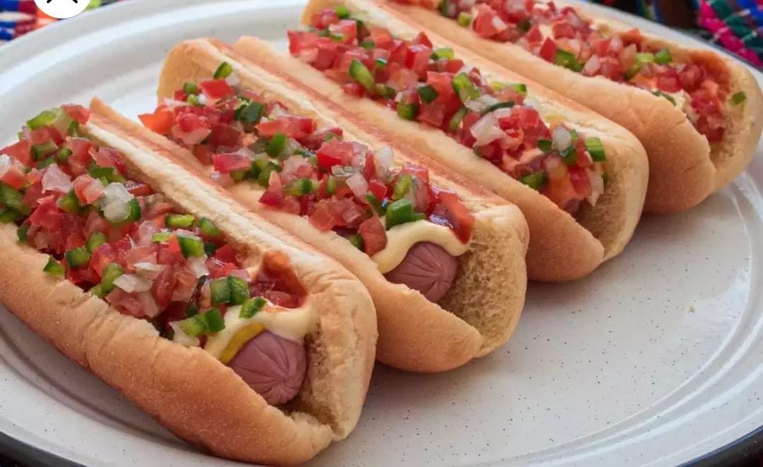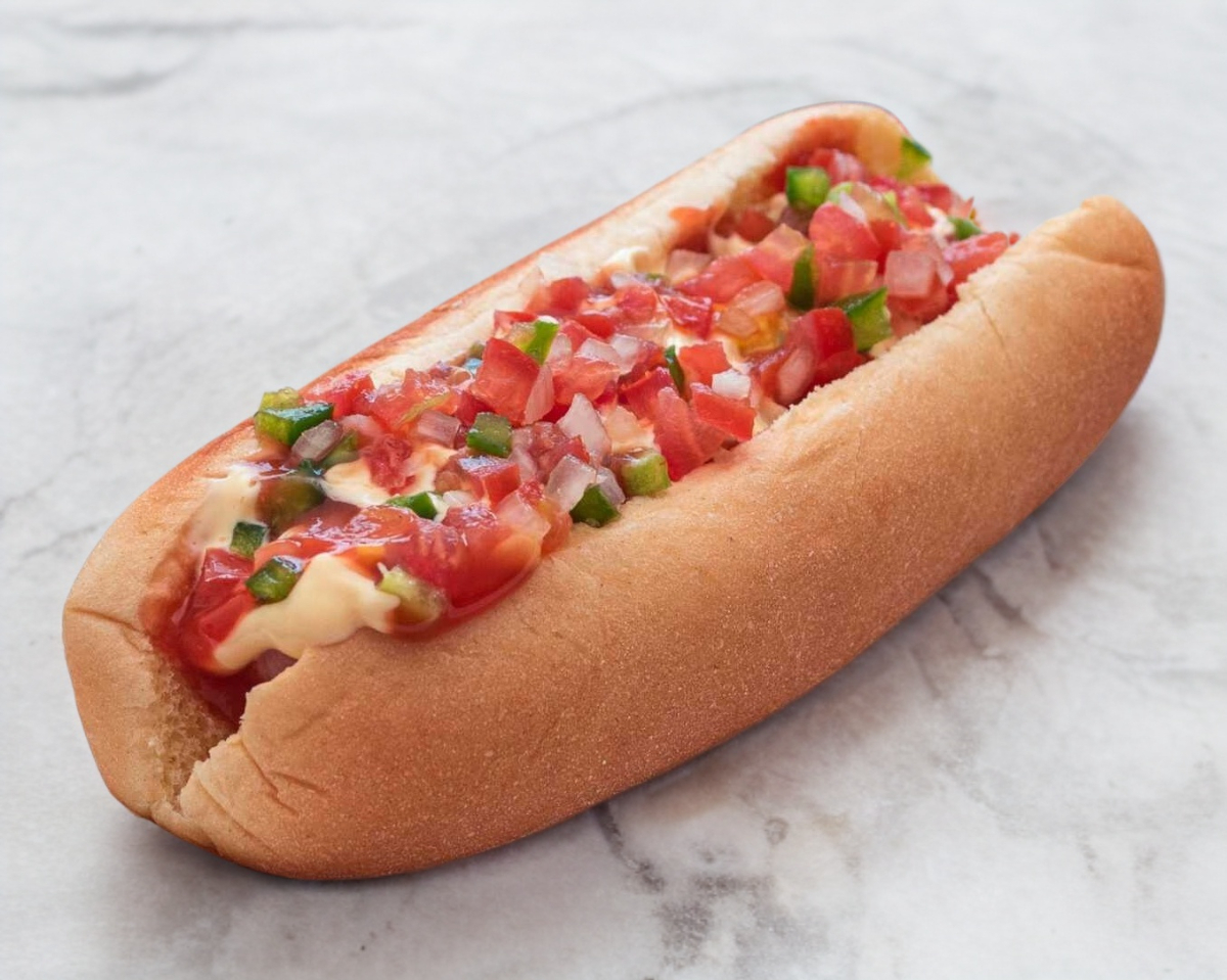 Una pieza de hot-fog con los aderezos de tu elección, acompáñalos con rajas de jalapeño o pico de gallo y si te atreves topping de guiso.