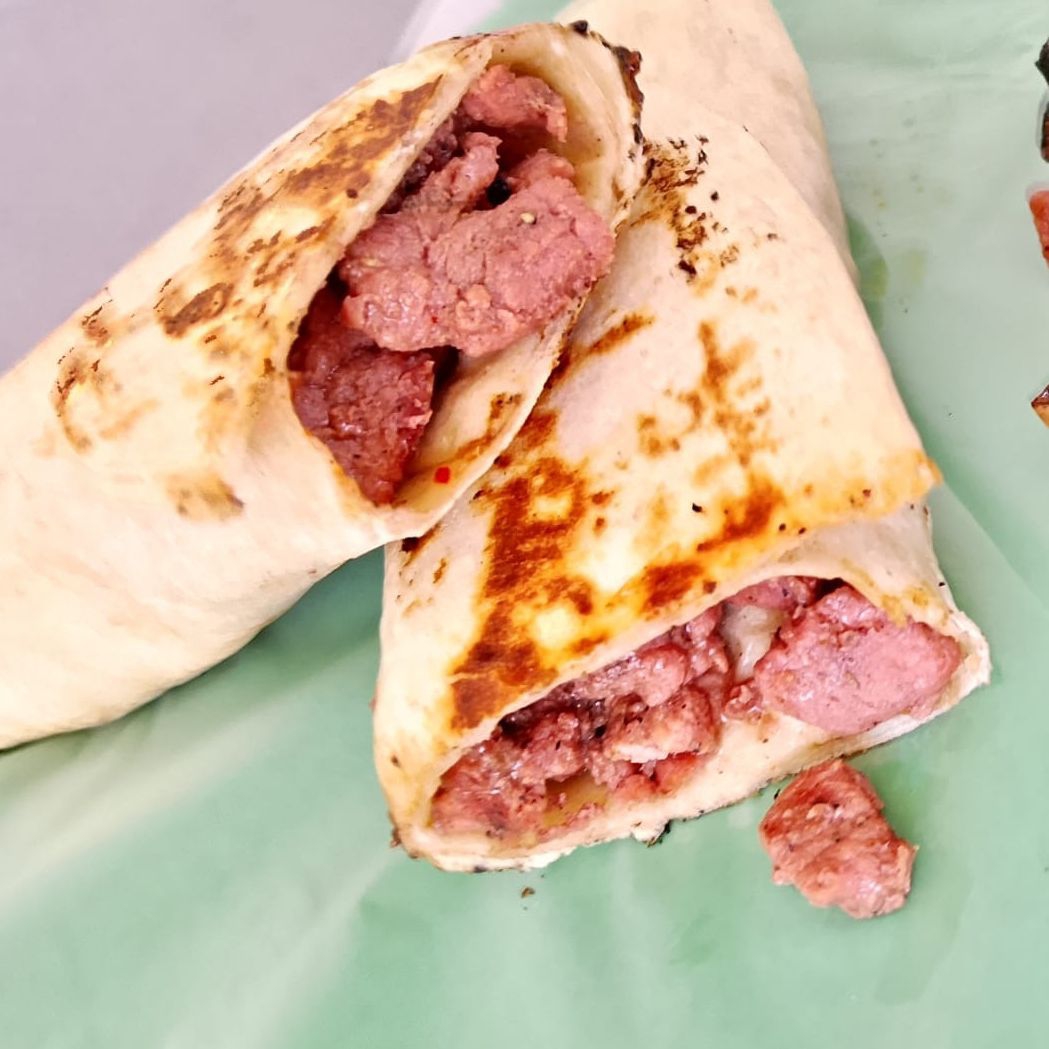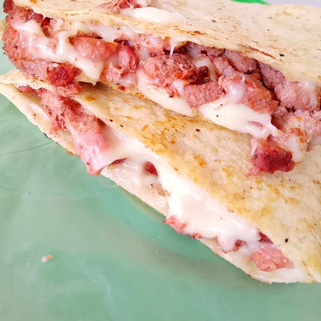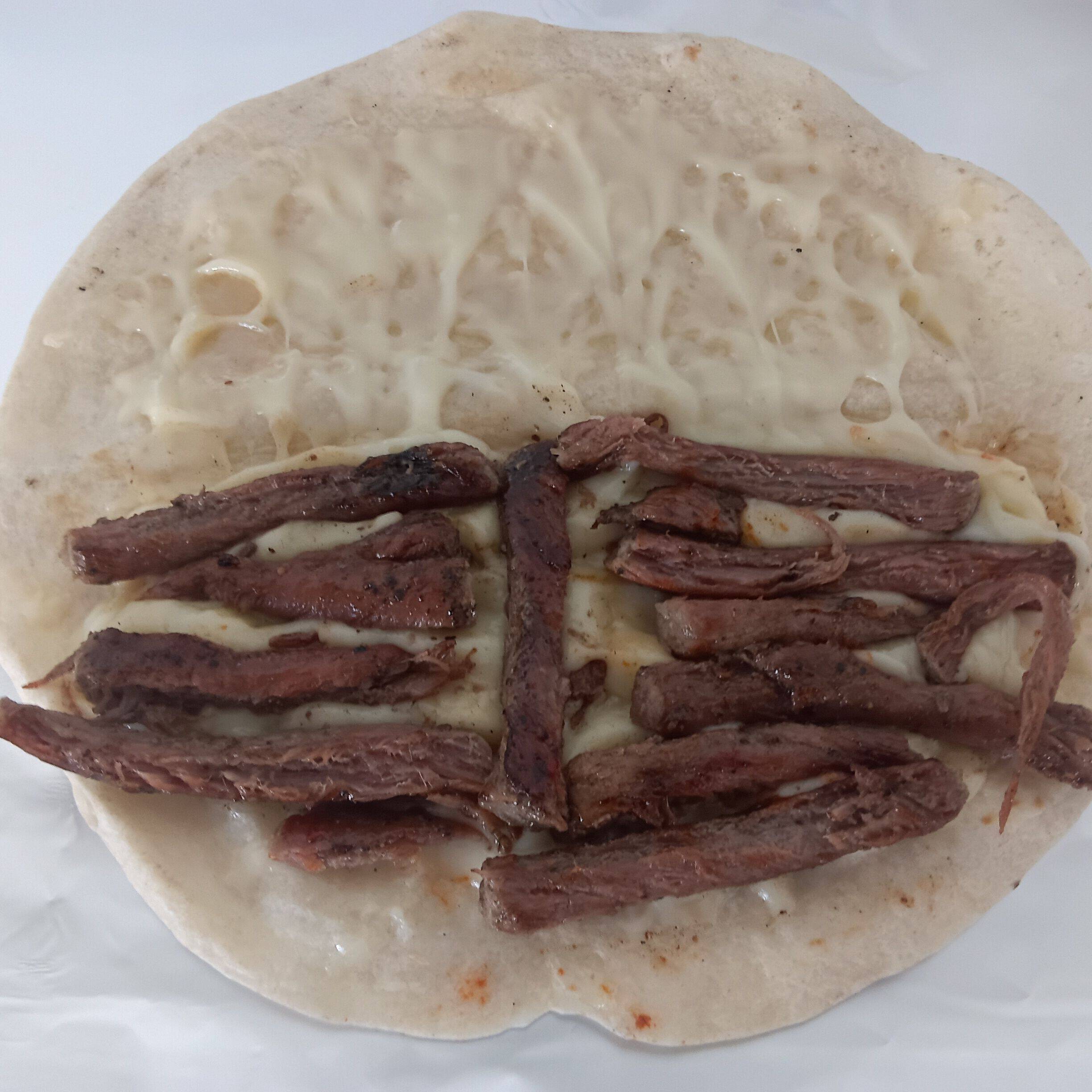 TORTILLA DE HARINA CON CARNE ASADA CON NUESTRO SAZONADOR CAMA DE QUESO FUNDIDO DELICIOSA*APARTE* INCLUYE SALSA ROJA SALSA VERDE Y SALSA DE LA CASA CEBOLLA PICADA Y LIMONES