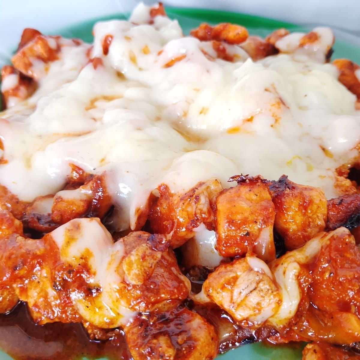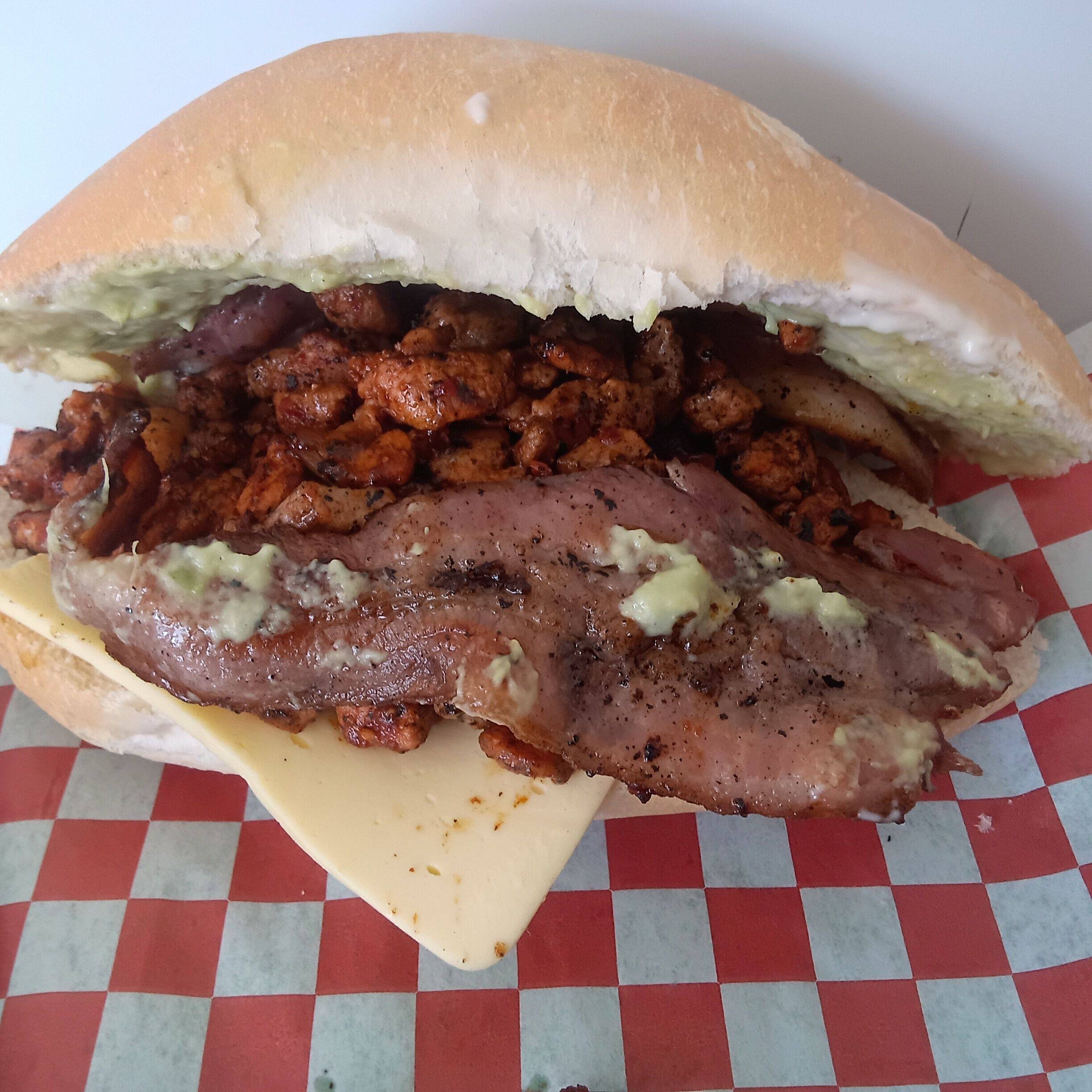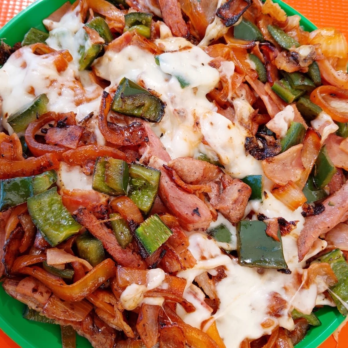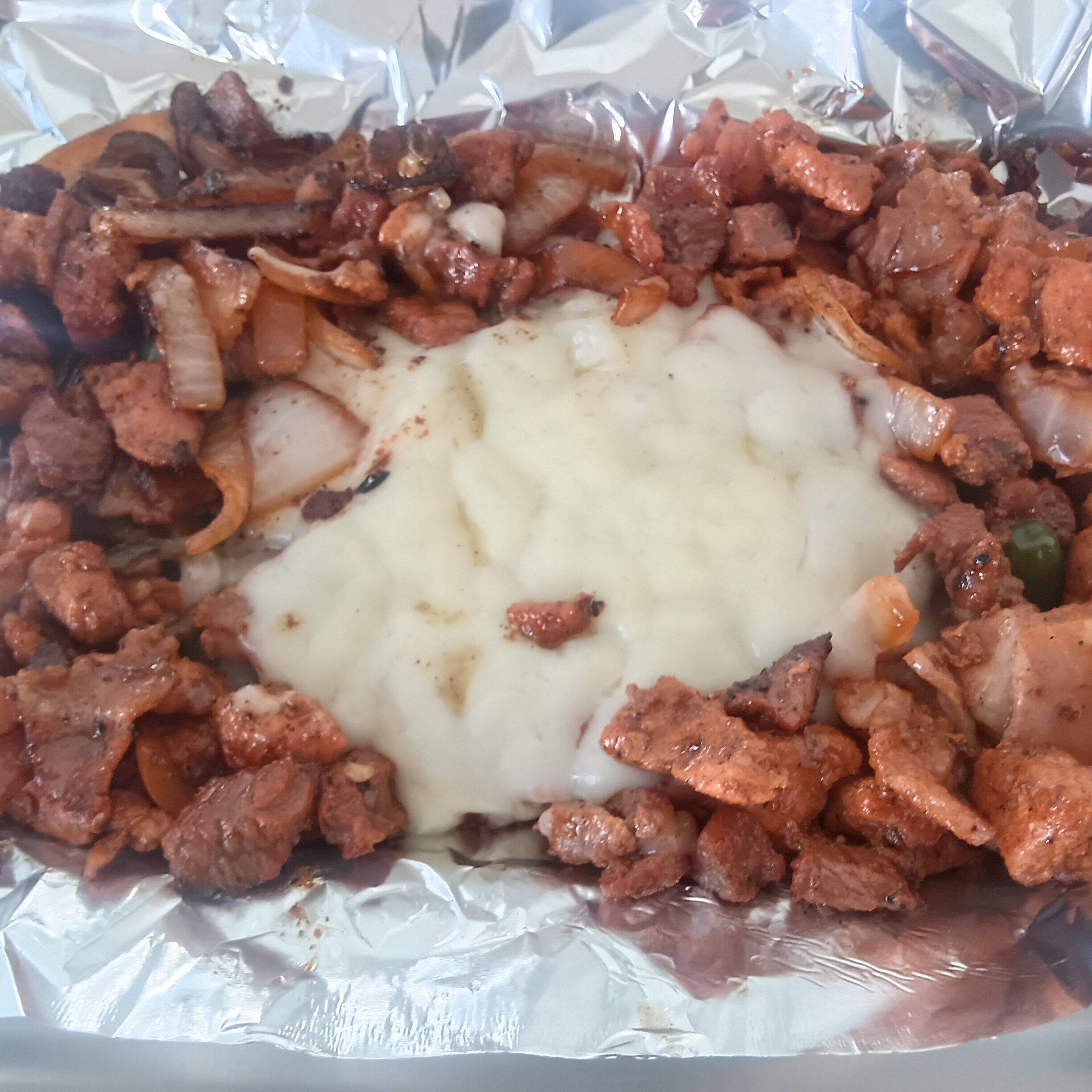TIRAS DE ARRACHERA TOCINO JAMÓN QUESO FUNDIDO CHILE POBLANO CEBOLLA Y APARTE SALSA ROJA SALSA VERDE Y SALSA DE LA CASA CEBOLLA PICADA Y LIMONES SABROSO Y ABUNDANTE