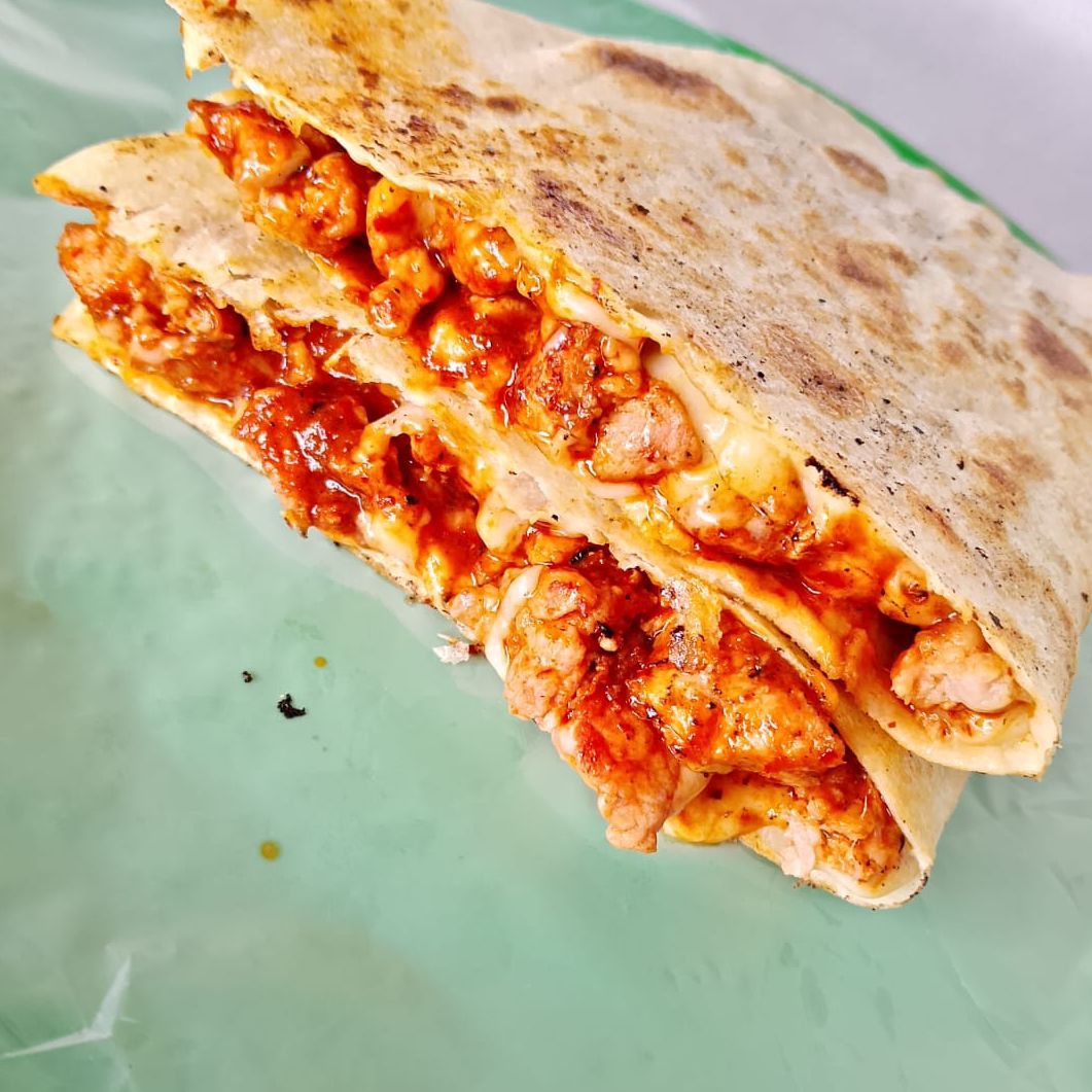TORTILLA DE HARINA CON CHICHARRÓN PRENSADO SAZONADO CON NUESTRO ADOBO Y UNA CAMA DE QUESO FUNDIDO CEBOLLA PICADA Y LIMONES