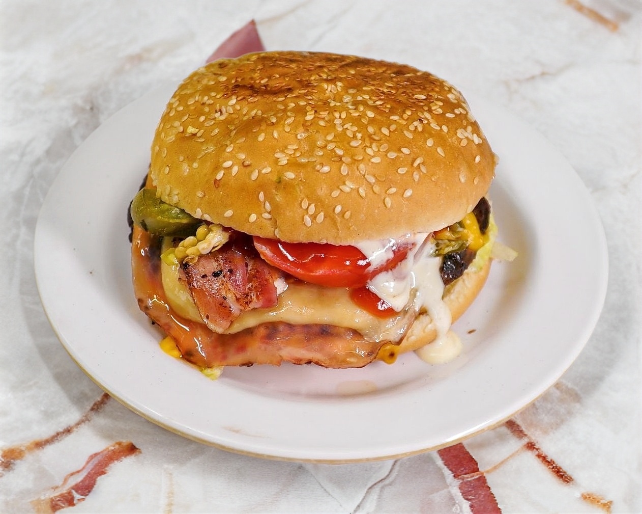 Queso amarillo, tocino, lechuga, tomate, chile, mayonesa y mostaza.