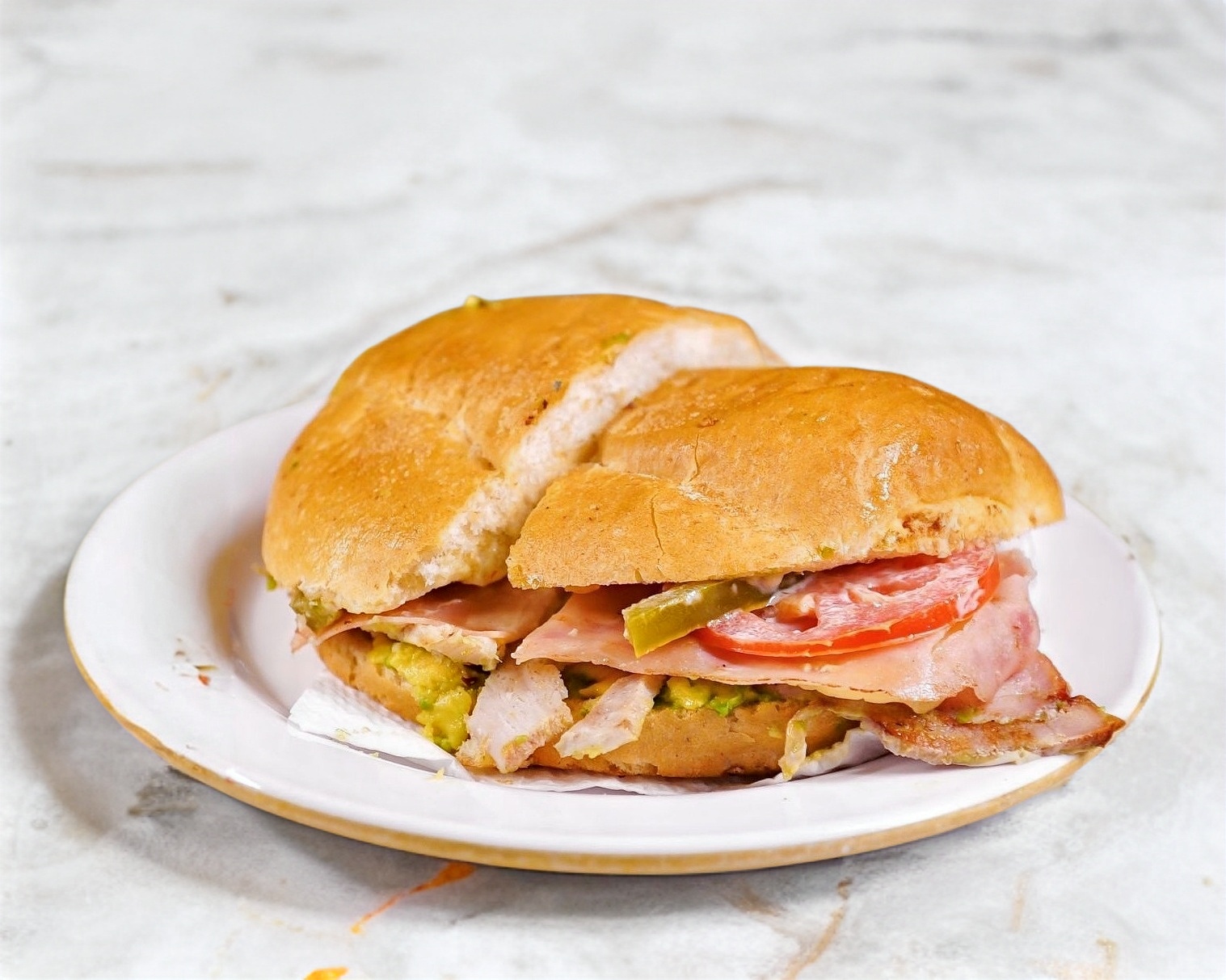 Tortilla de harina doble, queso blanco, jamón, aguacate, lechuga, tomate, chile y mayonesa.