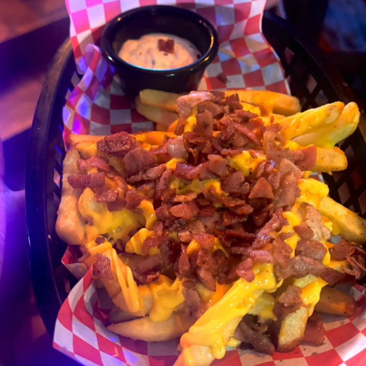 Salchicha de pavo envuelta en tocino, mayonesa, Boneless buffalo y queso cheddar. (incluye waffle Fryes)