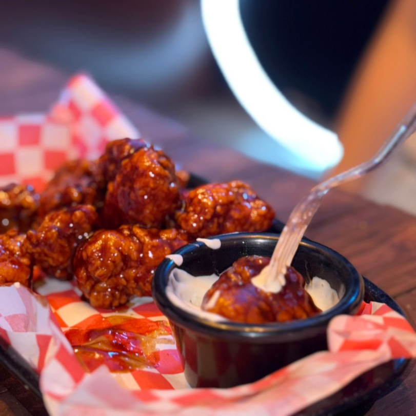 Boneless de Pollo (10pz) bañadas en tu salsa favorita, acompañadas de vegetales y ranch.