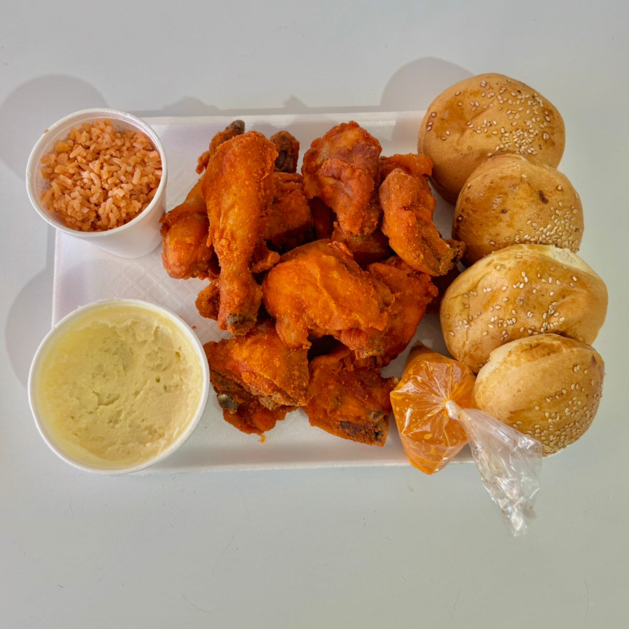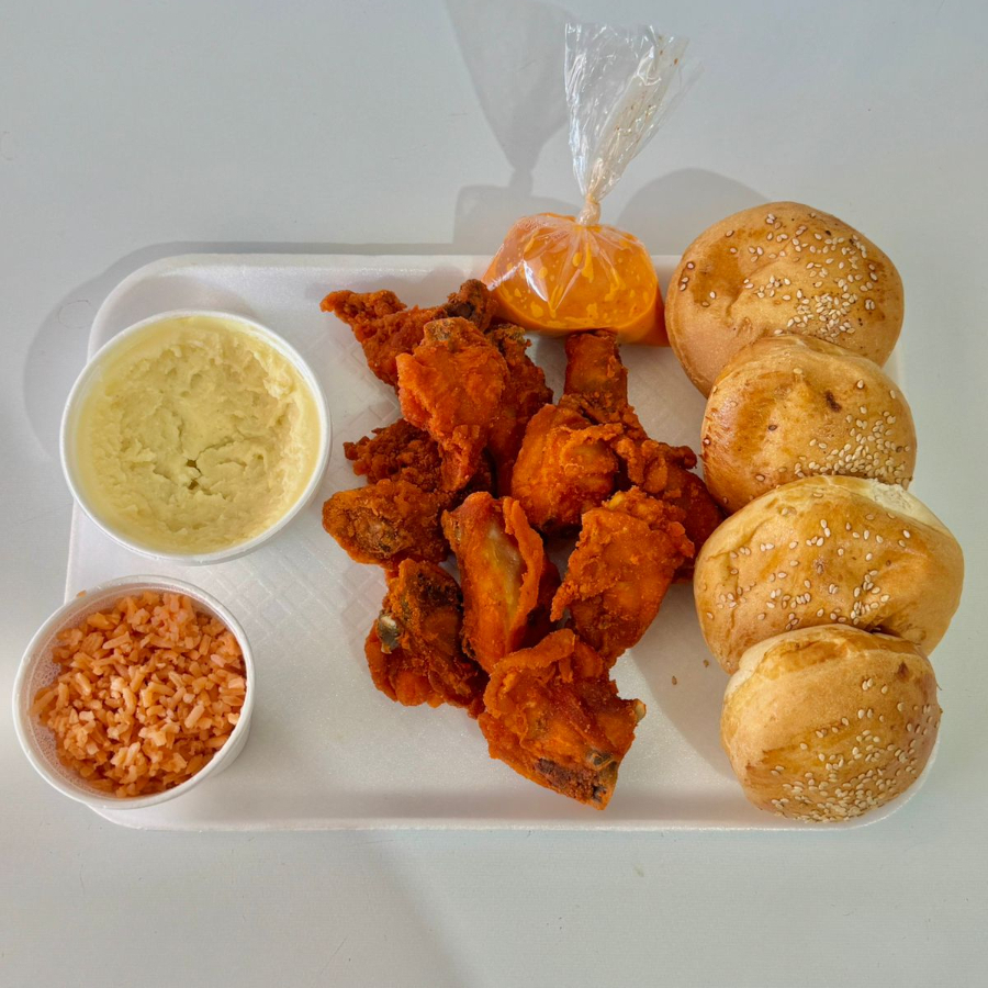 1 Kg. de Pollo Empanizado, 1 Vaso de Arroz, 1 Vaso de Pure, 4 Panes y 1 salsa
