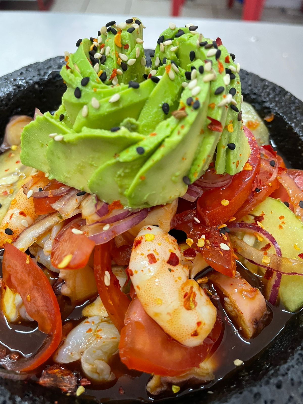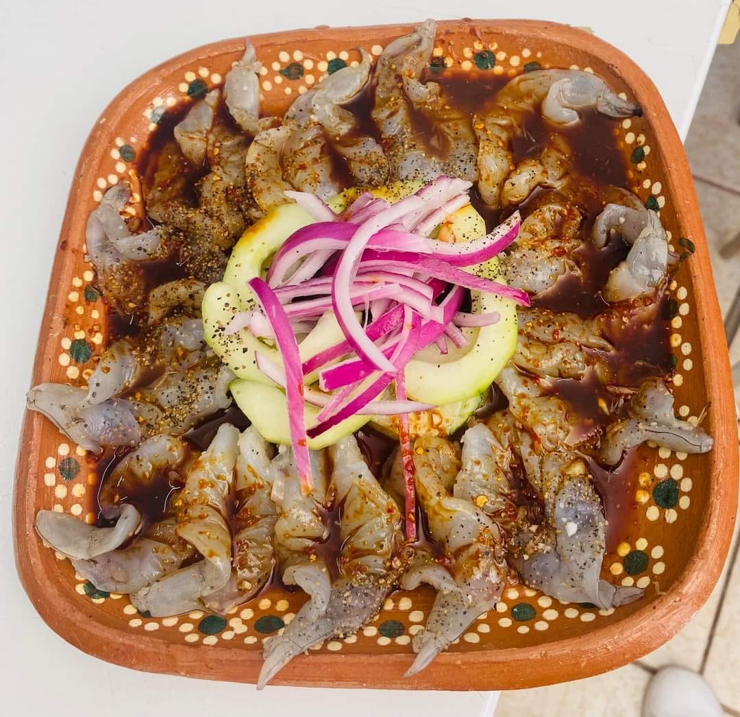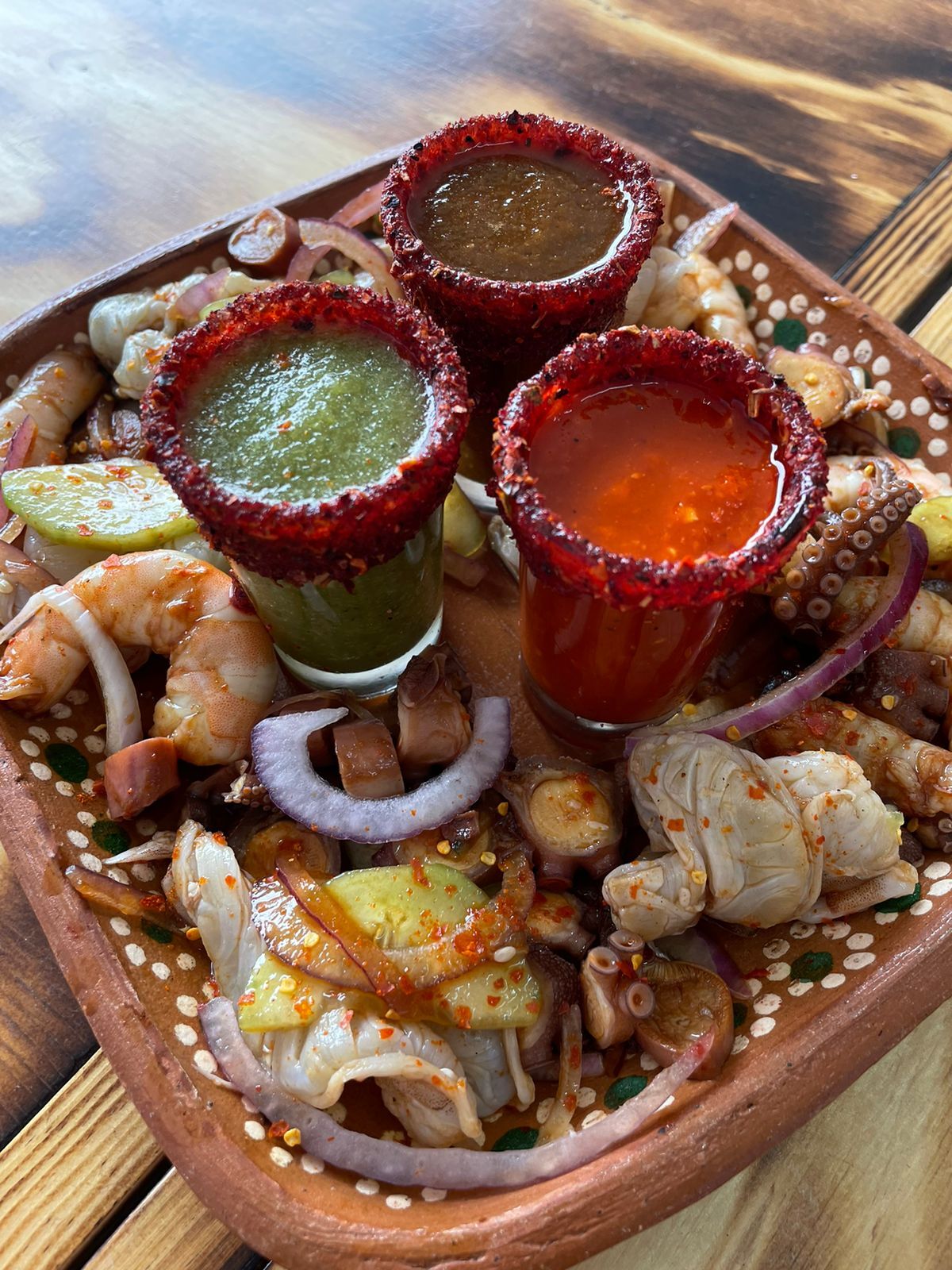 Camarón cocido, pulpo y aguachil en salsa chiltepín, Clamato y salsa negra de la casa.