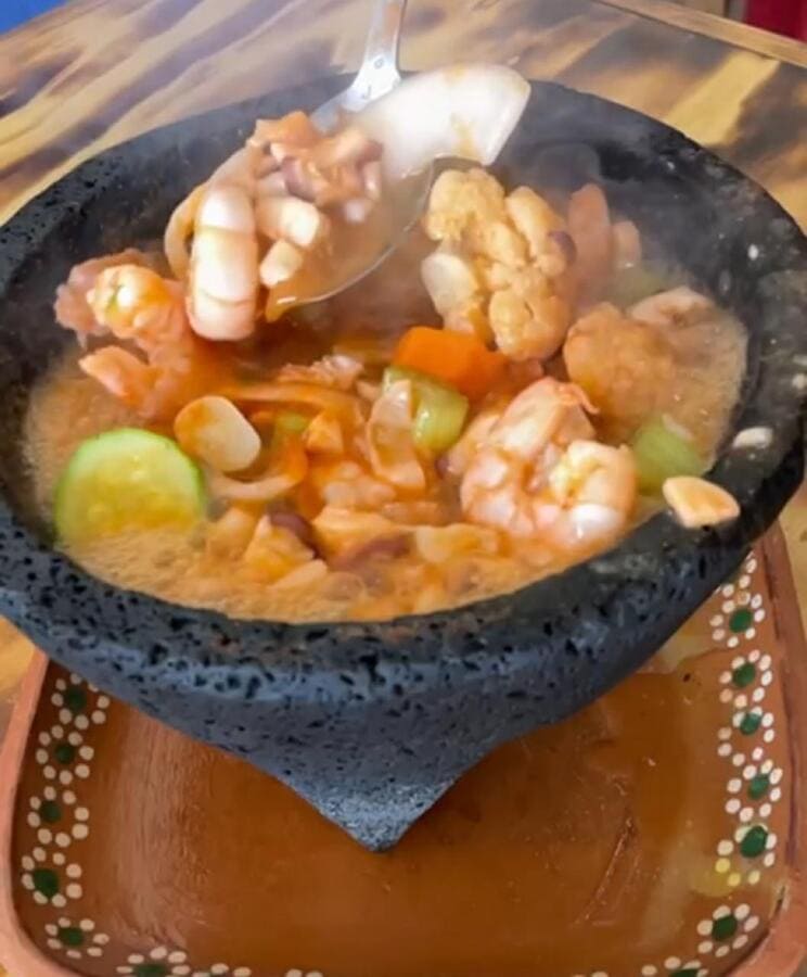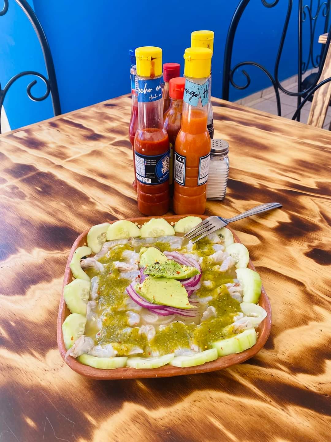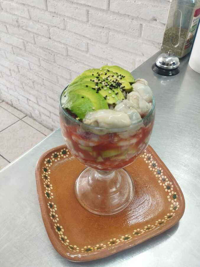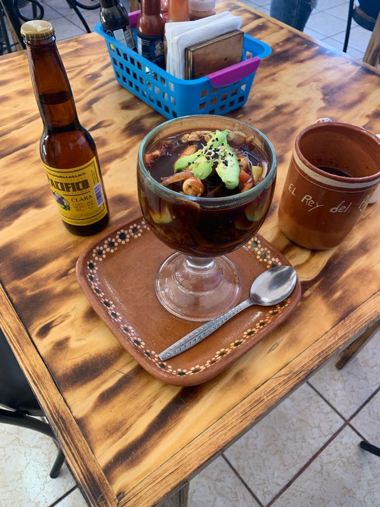 Camarón cocido, pulpo y aguachil en salsa chiltepín, Clamato y salsa negra de la casa.