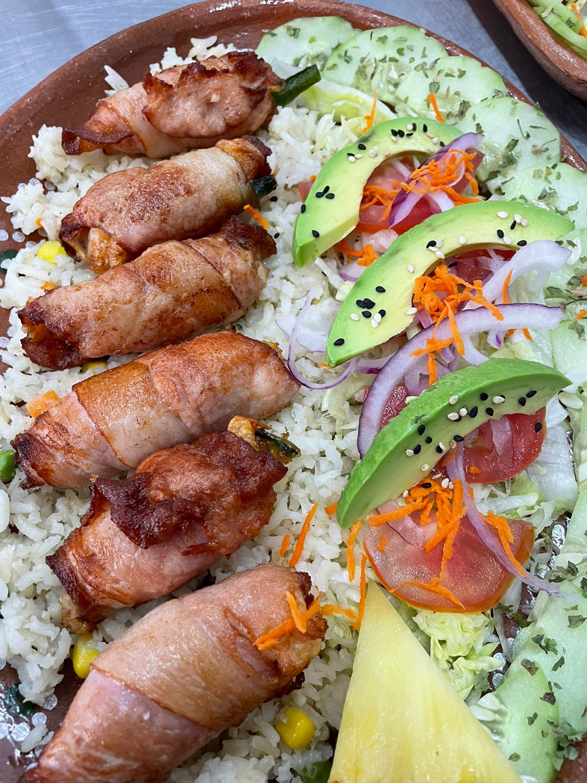 Rellenos de queso y envueltos en tocino, acompañados de arroz y ensalada.