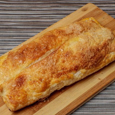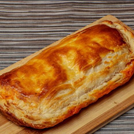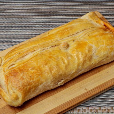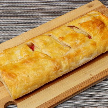 Relleno con salsa de tomate, queso chihuahua, jamón, piña y crocante de azúcar en la parte superior