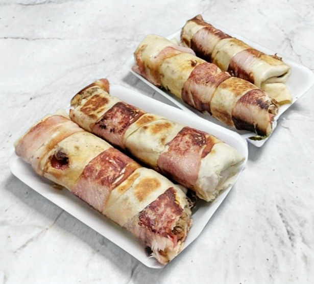 Burro super Guasave: Burrito gigante con camarón, aguacate,carne, tocino y champiñones. aproxadamente un kilo de sabor envuelto en tocino 3 carnes