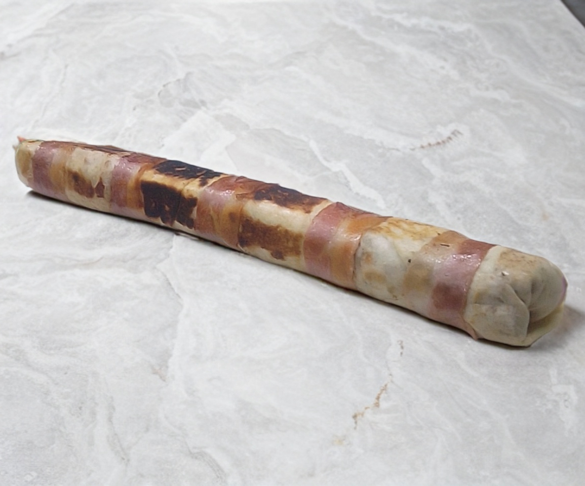 salchicha envuelta en tocino, champinones, cama de jamon con queso y aderezo