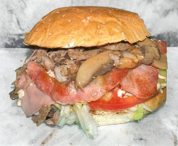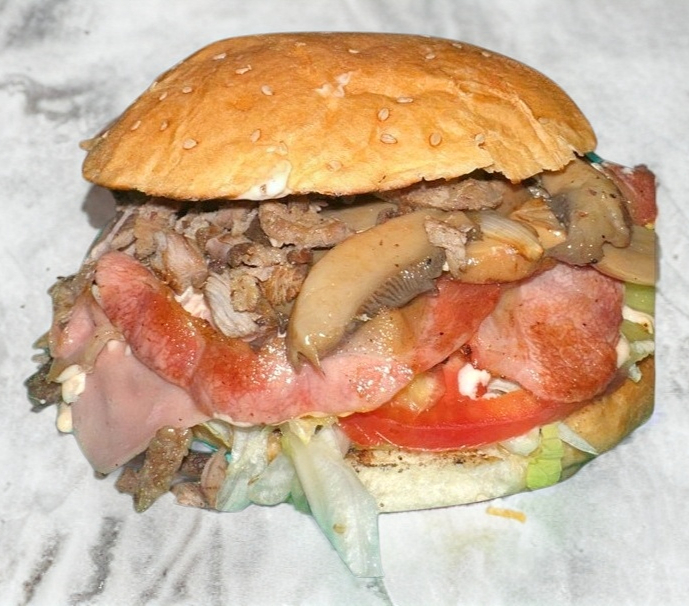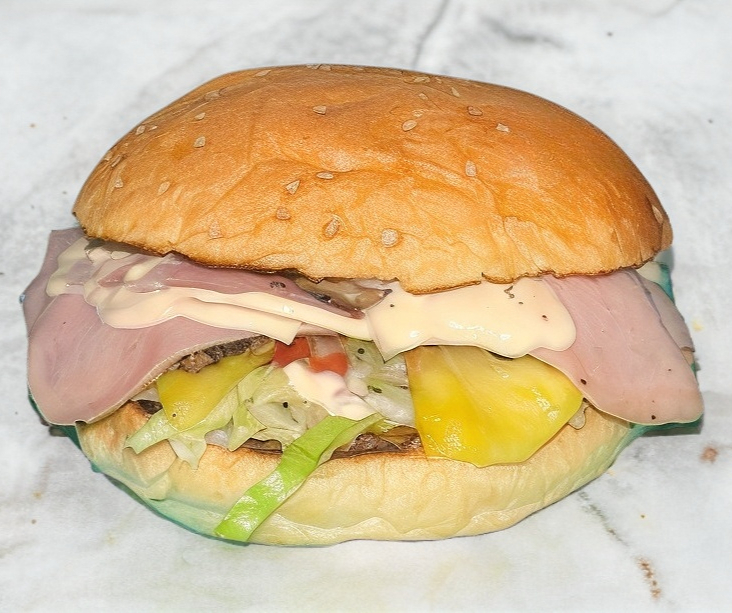 Hamburguesa Especial: Con piña, champiñones, tocino, jamón y queso.