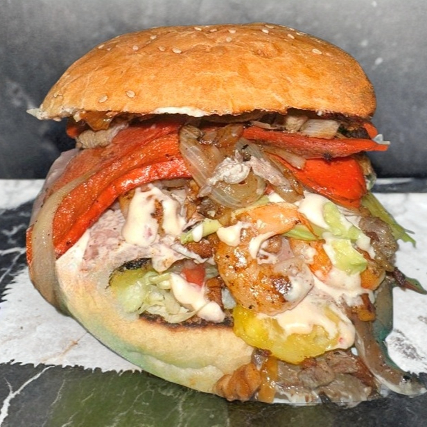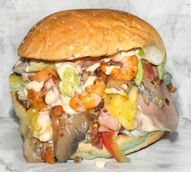 Hamburguesa Mar y Tierra: Camarón, carne, aguacate, jamón y tocino en una sola burger. pina y champinones