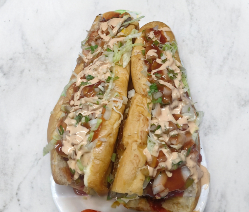 Tres salchichas, carne de hamburguesa, tocino y champiñones con aderezo chipotle, cebolla asada y salchicha para asar