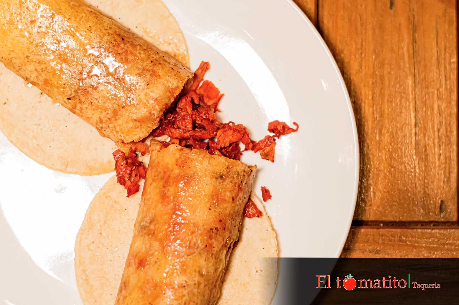 Delicioso Burrito hecho a base de contra de queso, montado sobre dos tortillas recién hechas relleno de Carne al Pastor