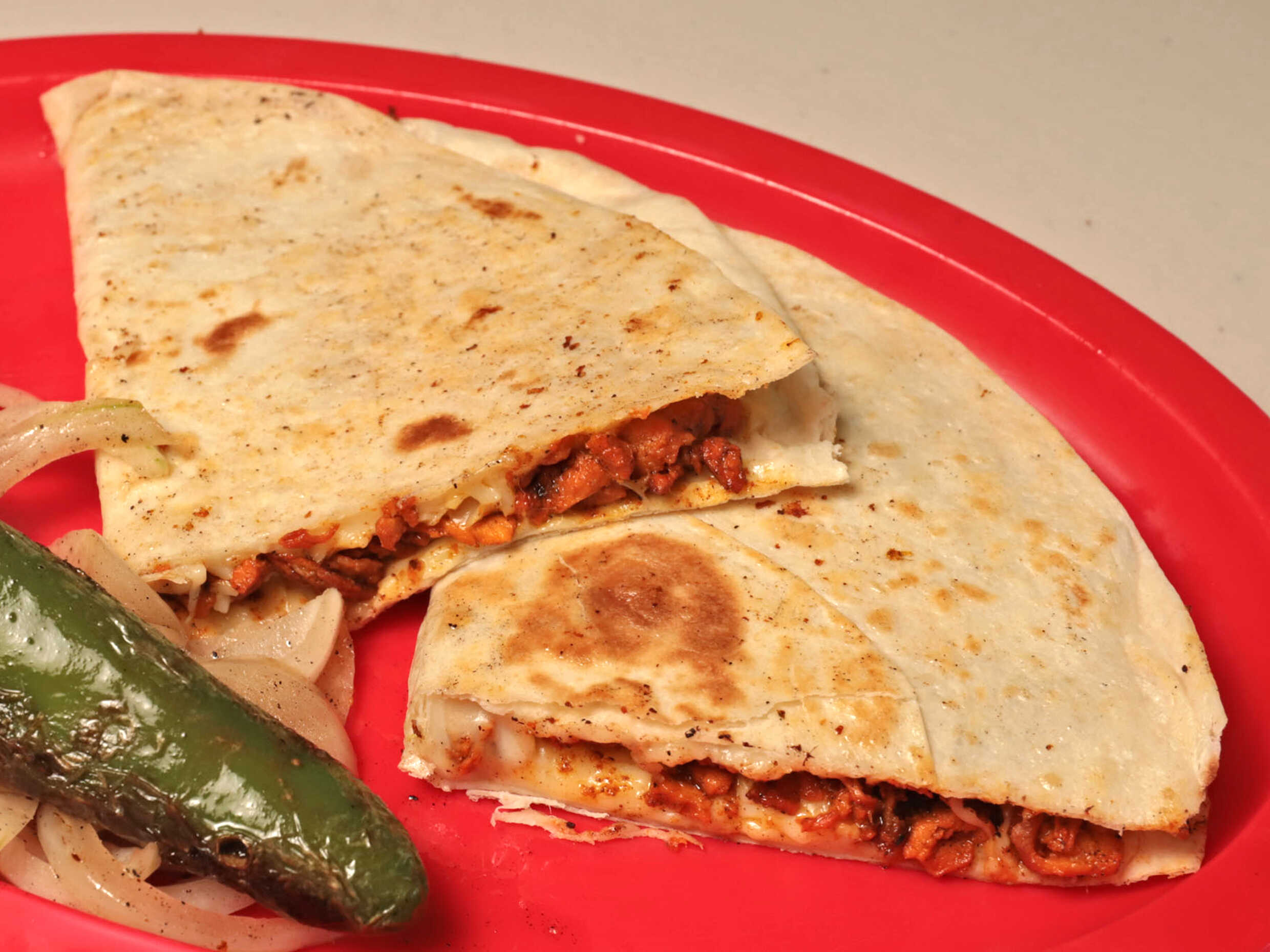 tortilla de harina con queso gratinado carne al pastor de excelente calidad y sabor incluye cebollita, limones 2 salsas y servilleta
