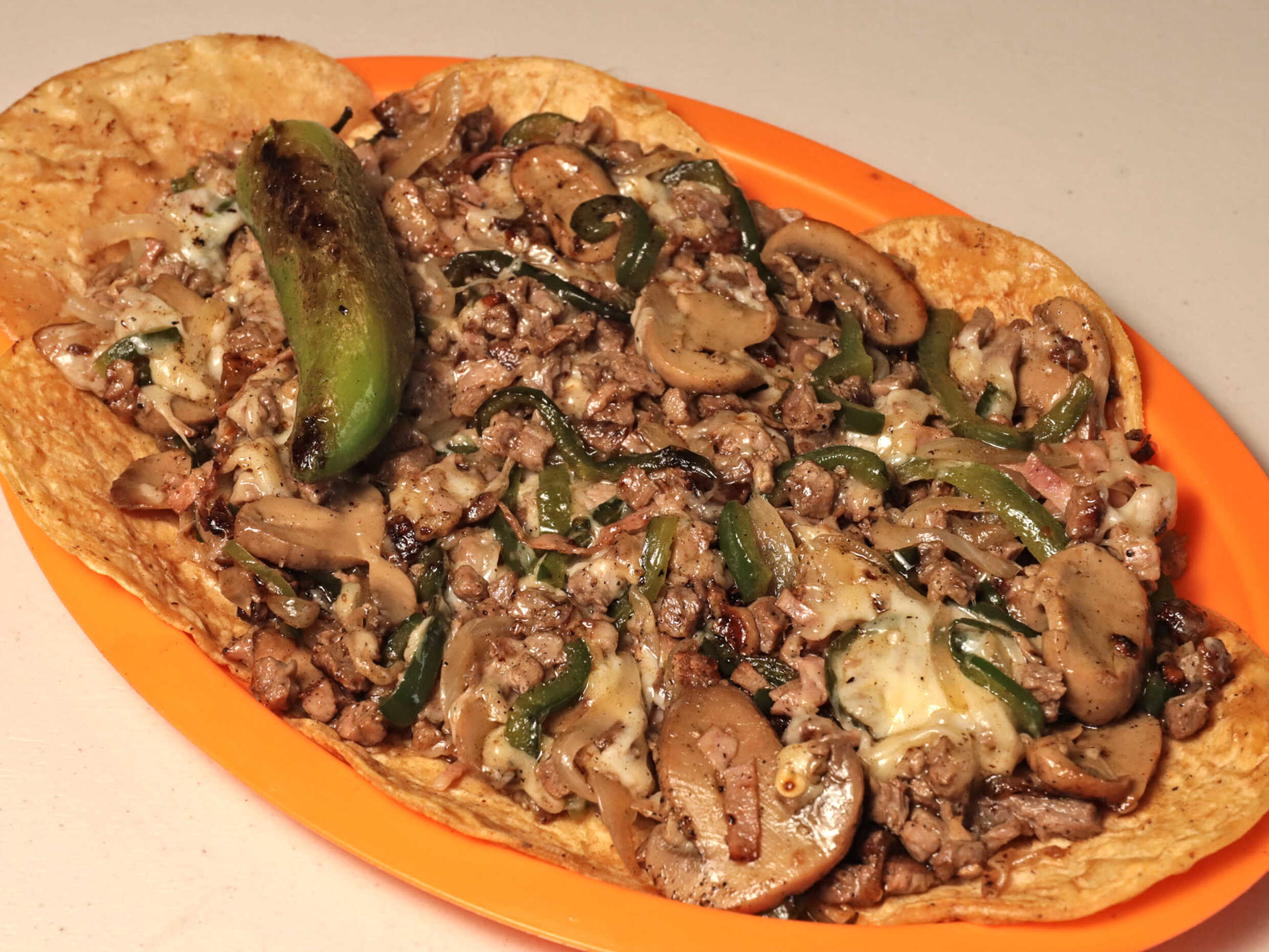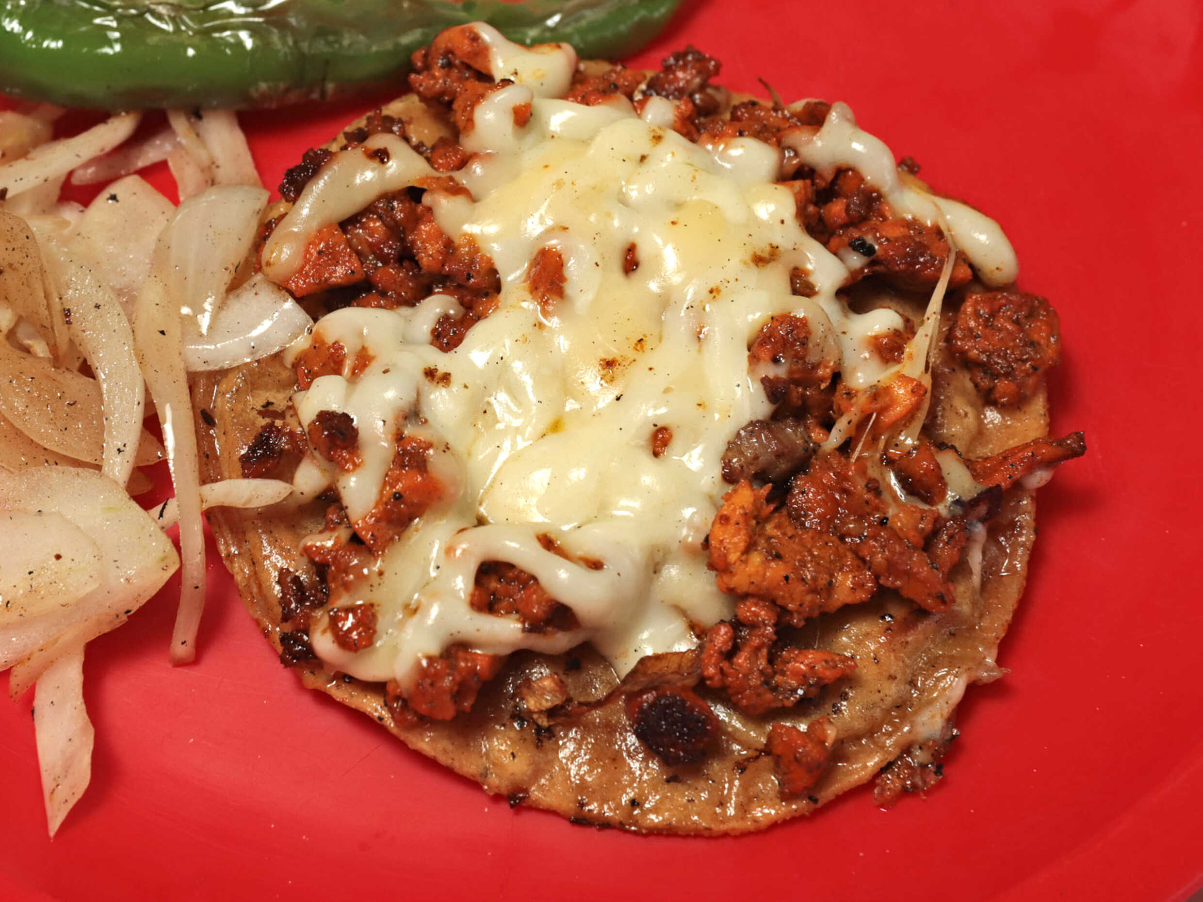 tortilla de taco tostada con queso gratinado carne al pastor incluye cebollita 2 salsas y servilleta