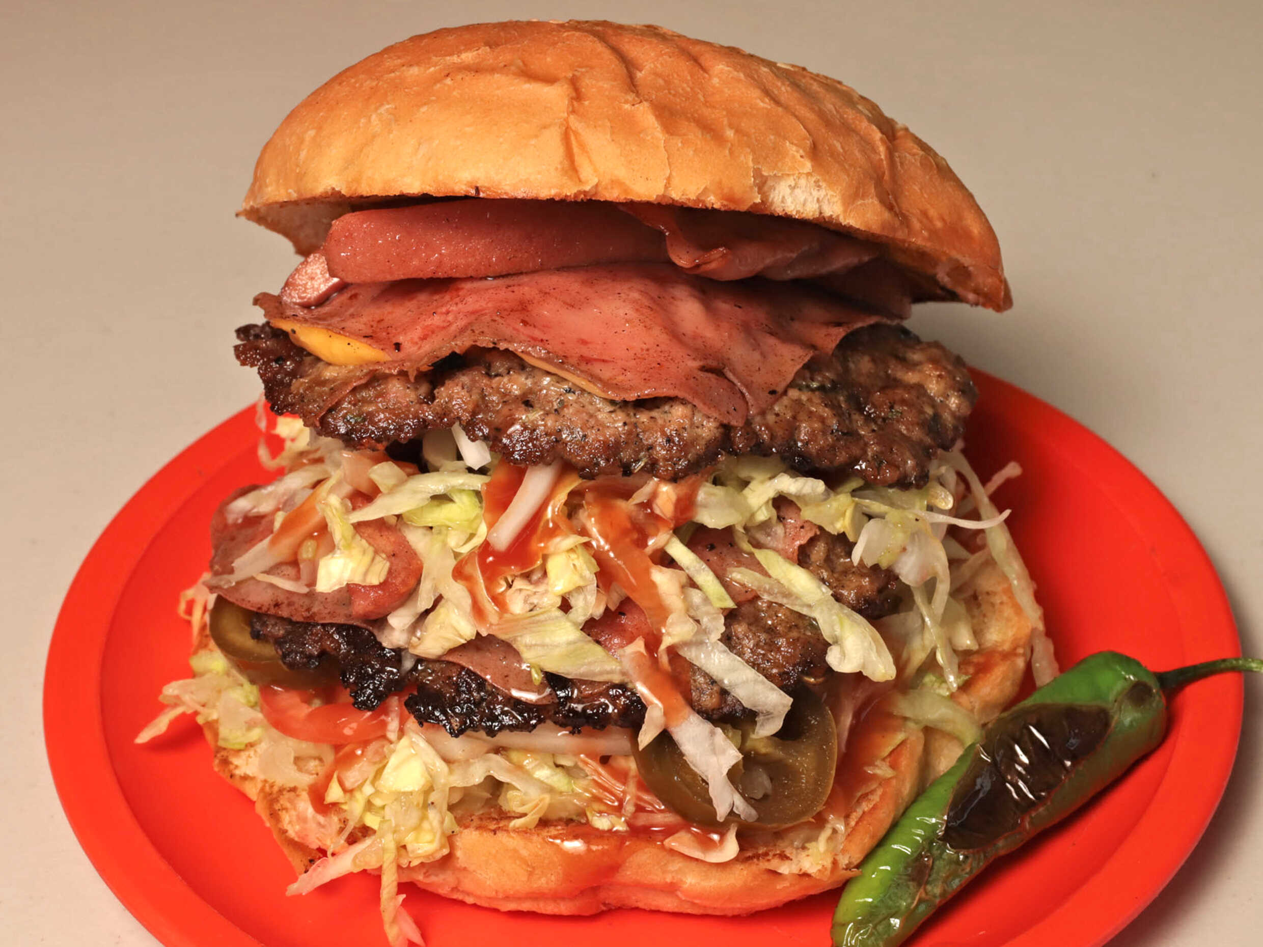 2 carnes que dan 250gr preparada con nuestra receta lleva lechuga, tomate, cebolla chile, piña , jamon, queso blanco, queso amarillo, tocino y salchicha montada en pan artesanal lleva mayonesa y mostaza