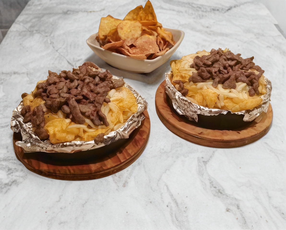 carne asada de excelente calidad y sabor acompañada de champiñones queso gratinado, poblano, tocino, cebolla asada en una cama de 8 tortillas incluye 2 salsas limones y servilleta