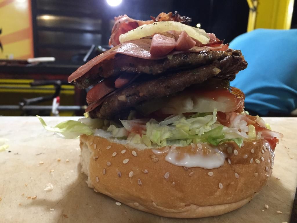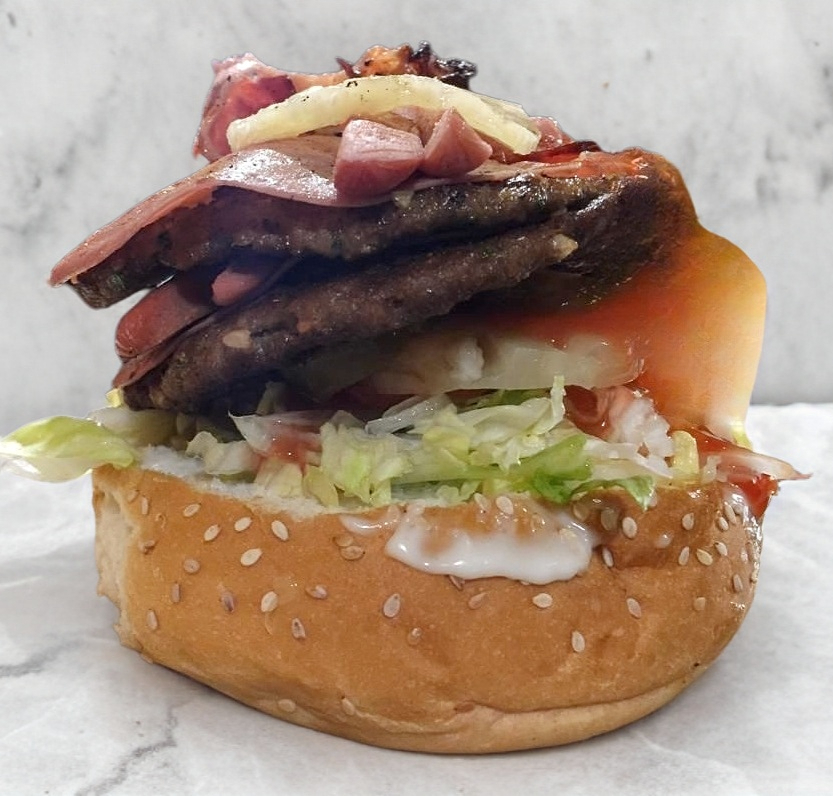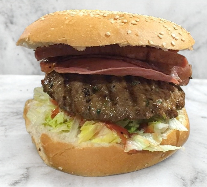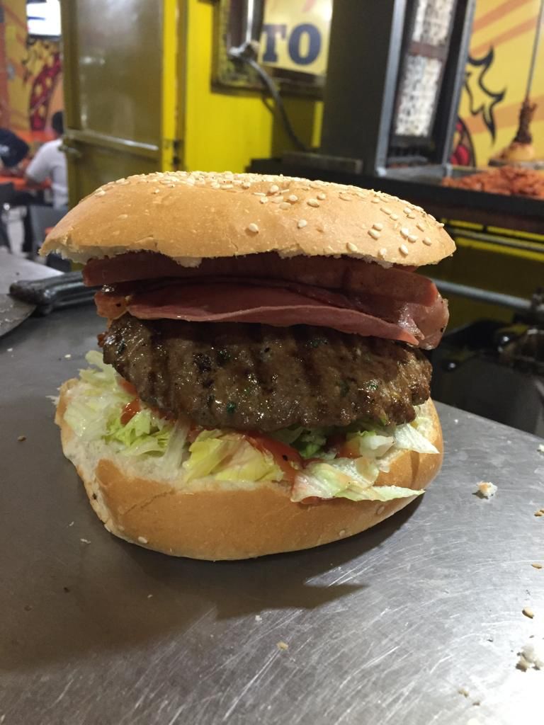 carne del dia fresca preparada con nuestra receta 130 gr con lechuga, tomate, cebolla chile, catsup, jamon, queso amarillo en pan artesanal con mayonesa y moztaza