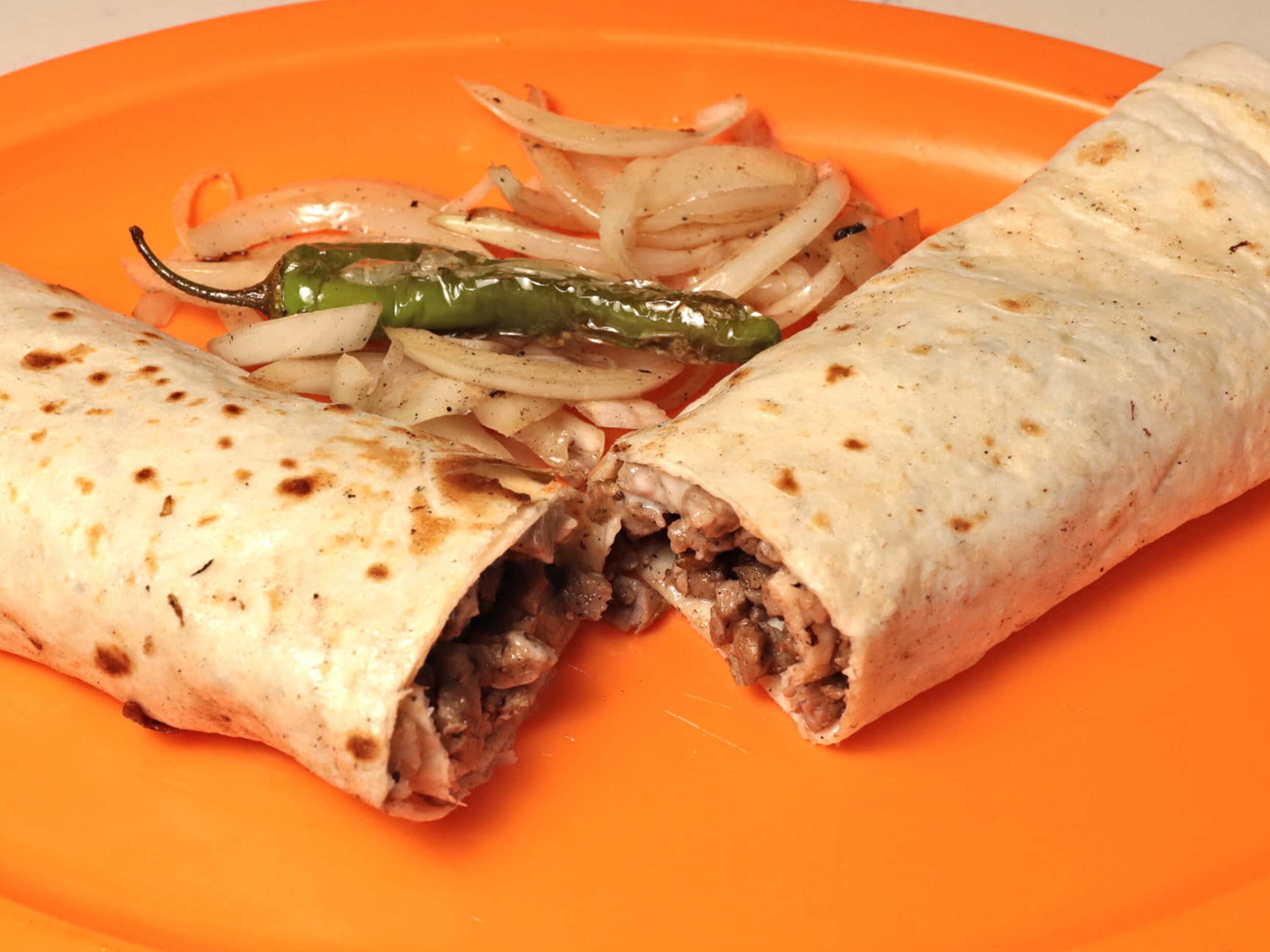 tortilla de harina con queso gratinado y carne asada de excelente calidad y sabor incluye cebollitas, limones 2 salsas y servilleta