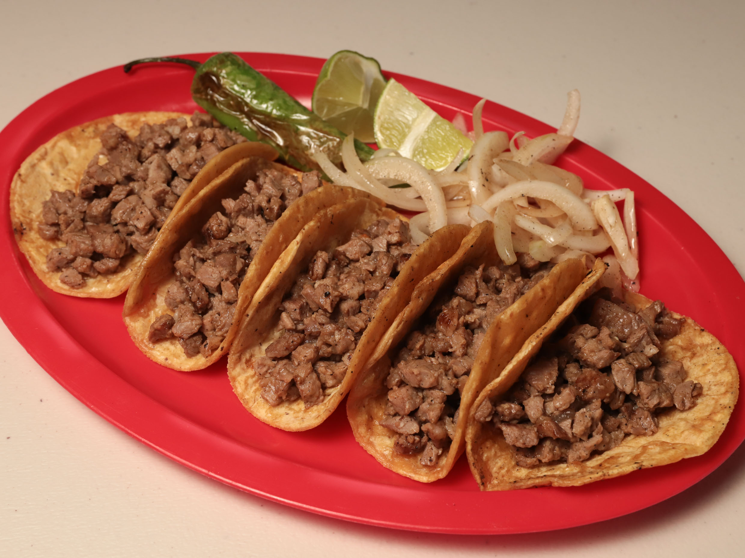 5 tacos de carne asda de excelente calidad y sabor, cebollita 2 salsas y limones