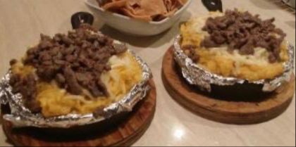 papa cocida de 500 gr con mantequilla queso gratinado, tocino carne asada, incluye tortilla para taco 2 salsas limones y servilletas