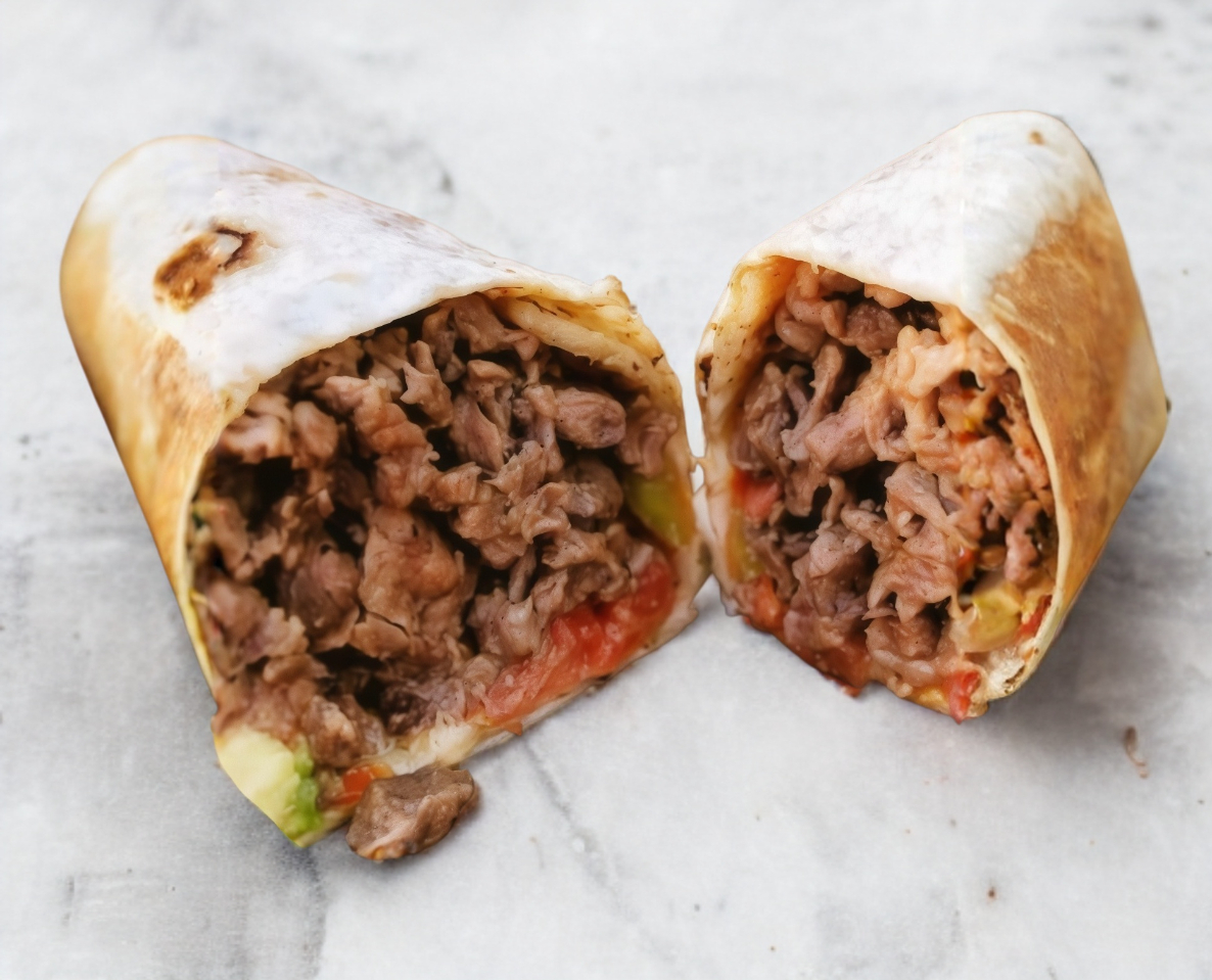 Carne asada de excelente calidad y sabor, acompañada de lechuga aguacate y mayonesa montado en tortilla de harina incluye cebollita, limon 2 salsas y servilleta