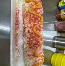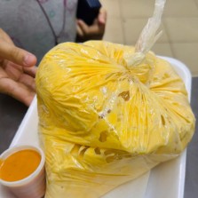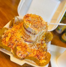 2 Elotes partidos, mantequilla, crema, mayonesa, limón, queso blanco, queso amarillo, chile en polvo, todo mezclado en una bolsa.
