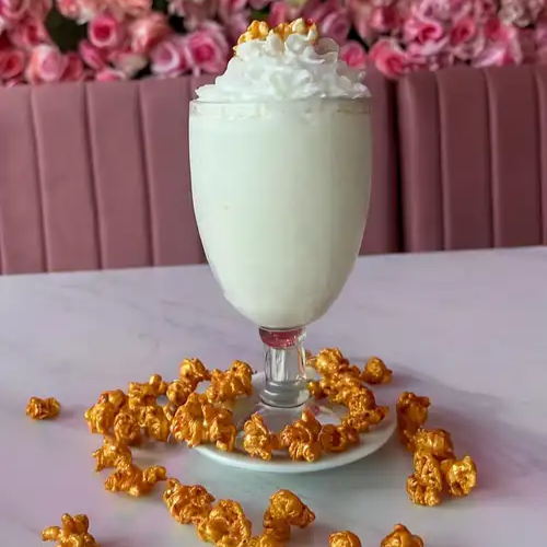 Una bebida única con esencia de palomitas de maíz. Decorada con palomitas acarameladas.