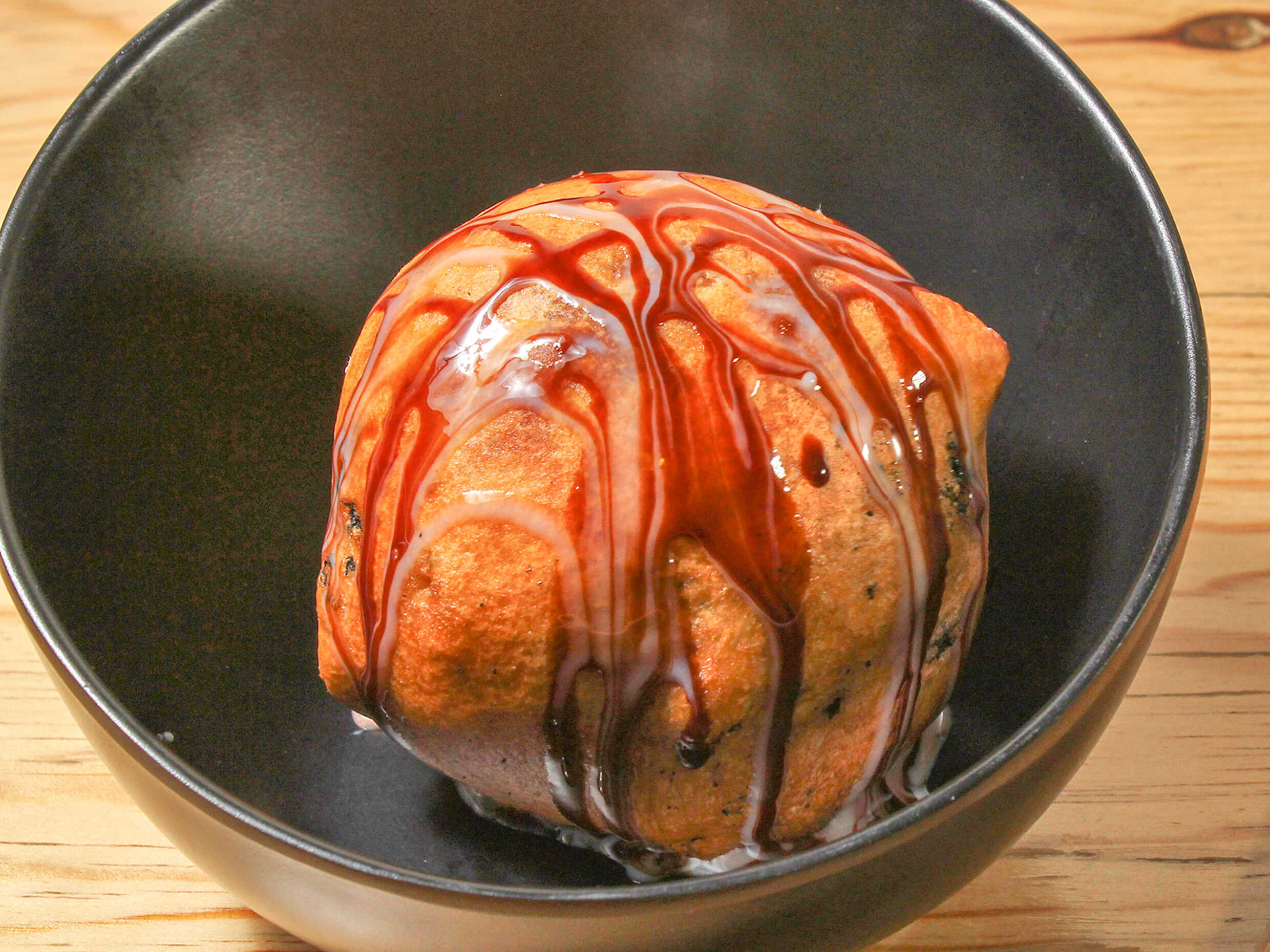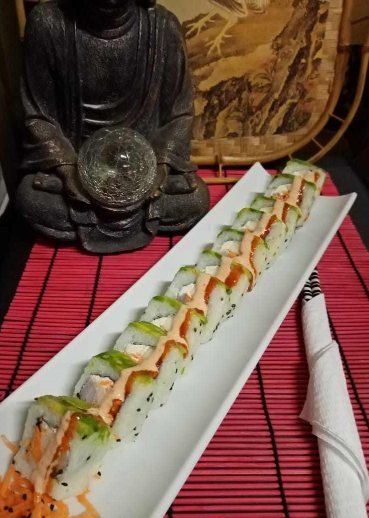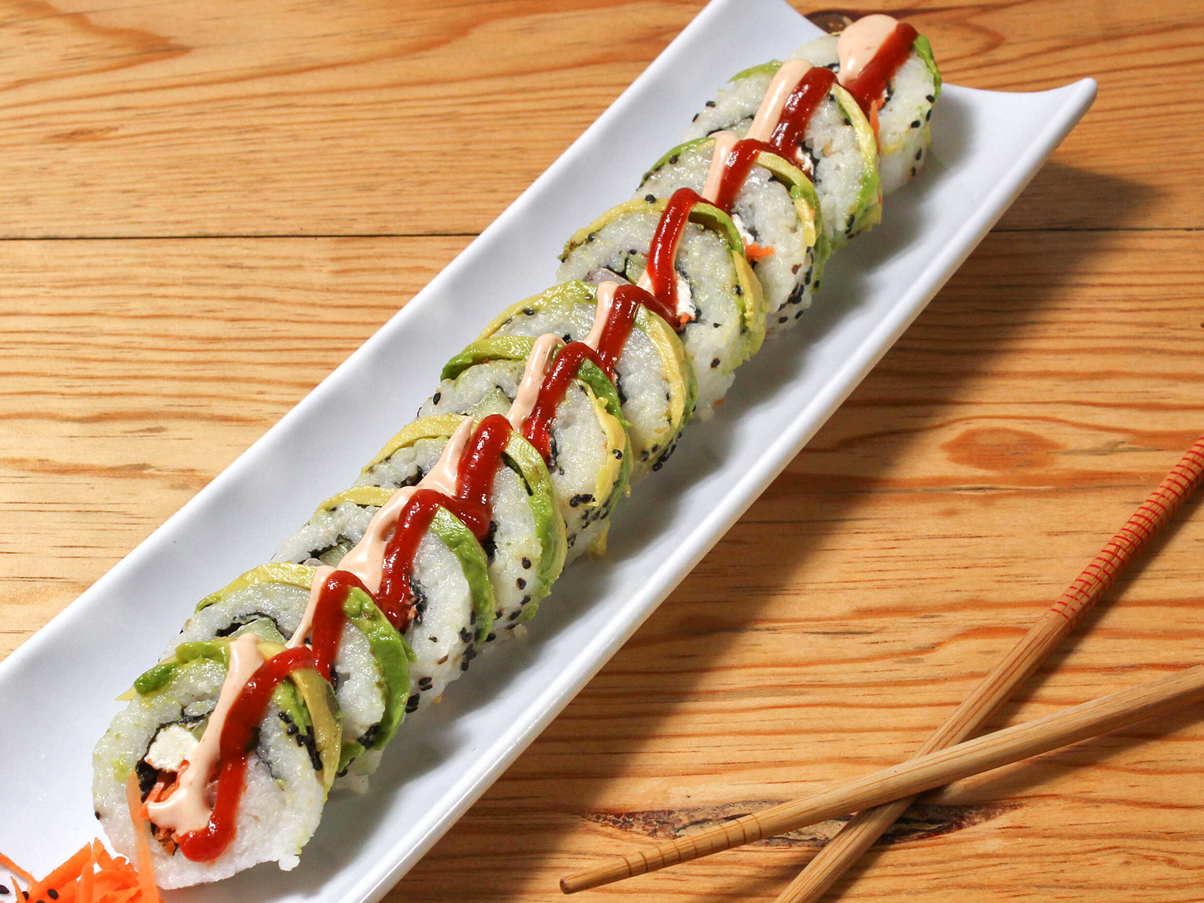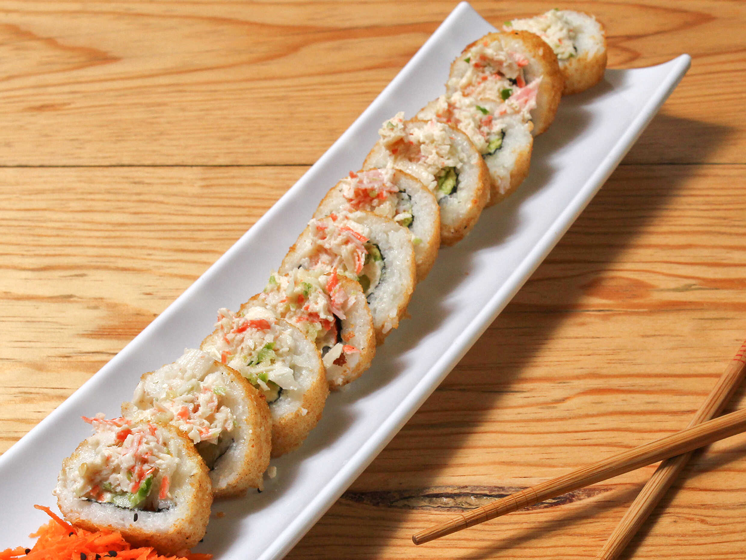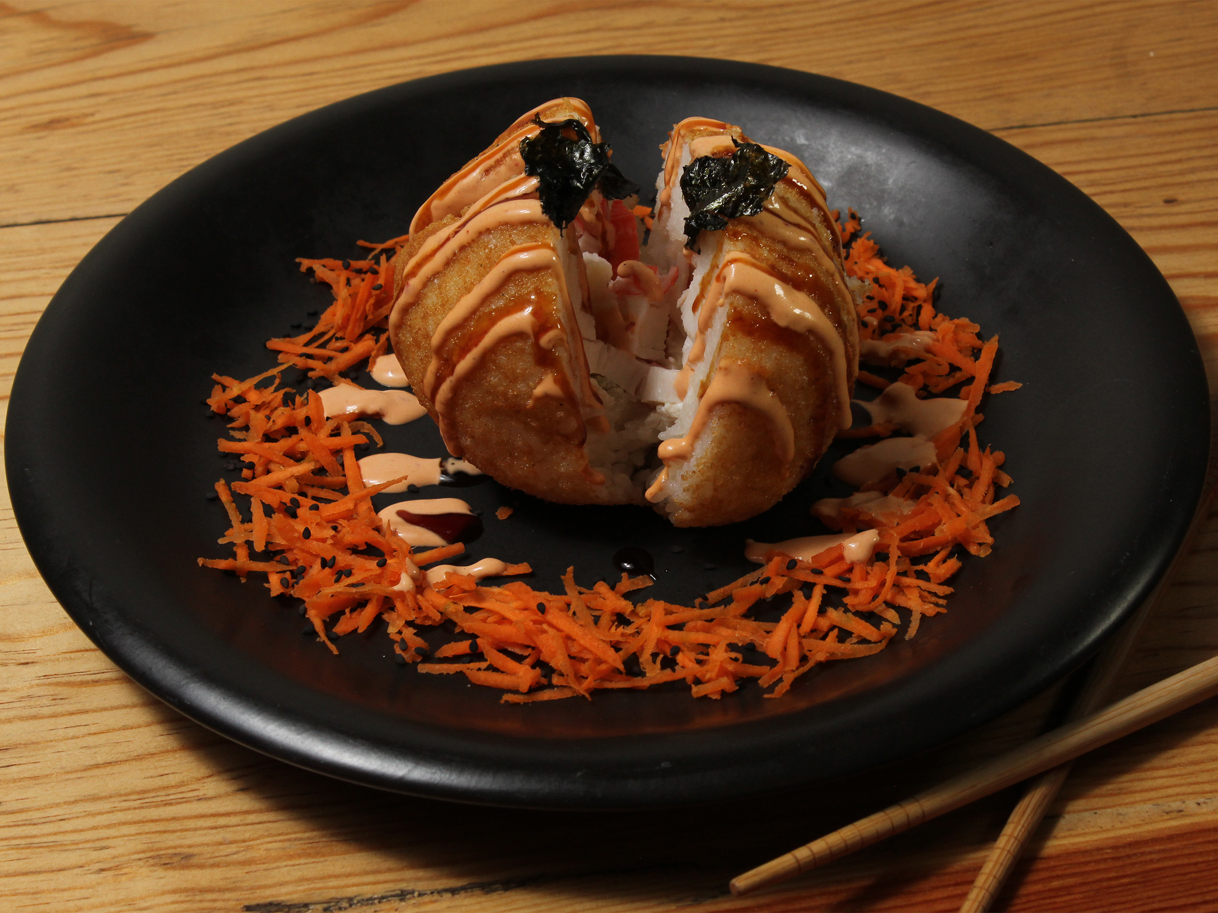 Sushi frito con cubiera de aguacate relleno de camarón/zanahoria, sushi frito cerdo BBQ y sushi frito de queso.
