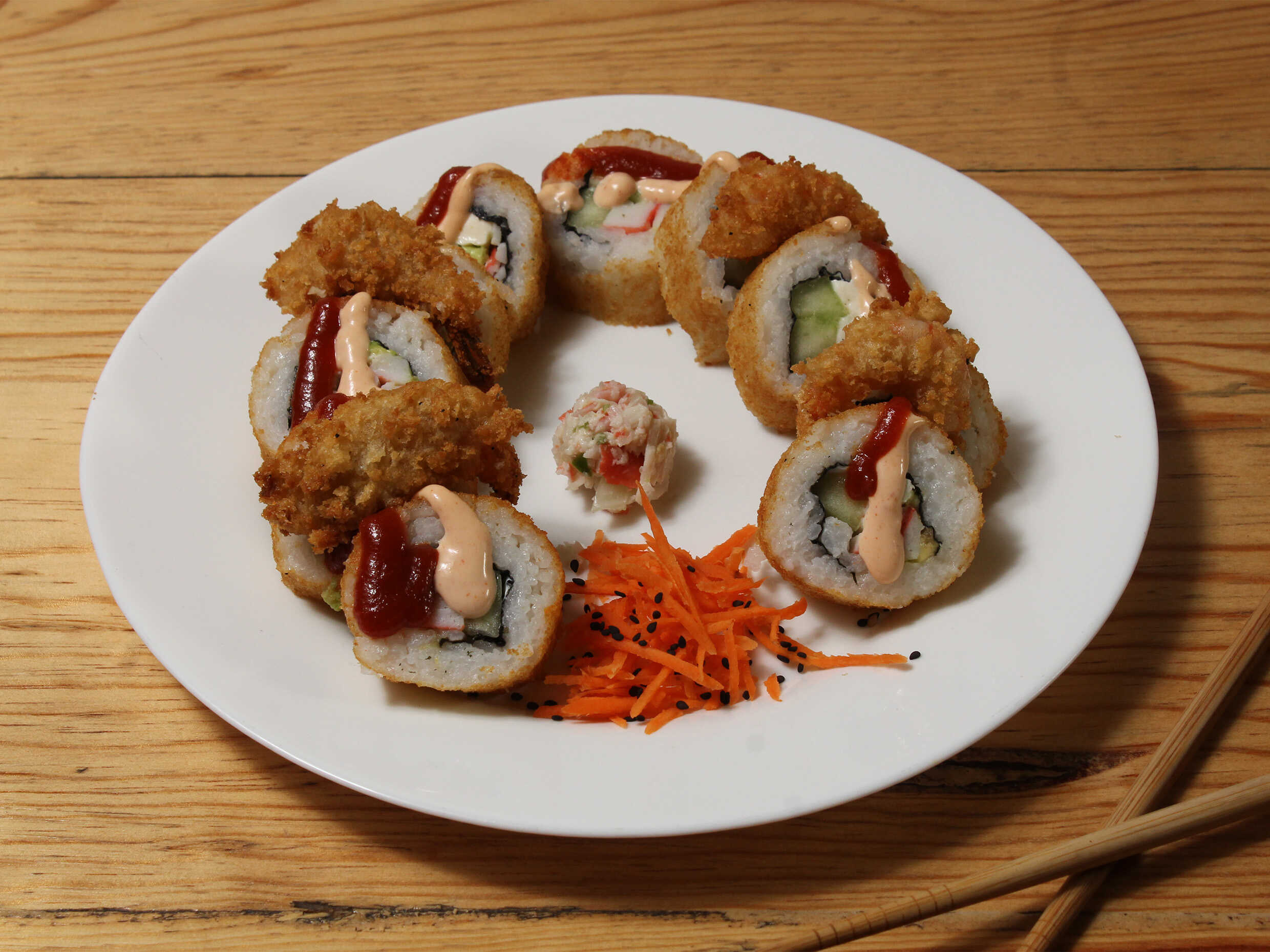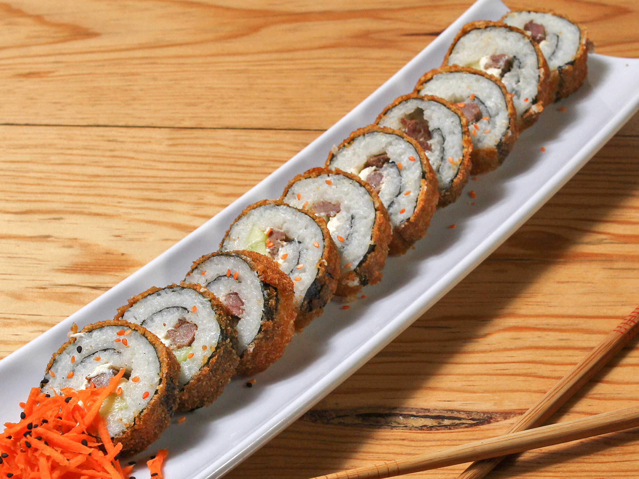 Sushi frito mar y tierra, sushi con alga por fuera camarón y sushi frito con marlín ahumado.