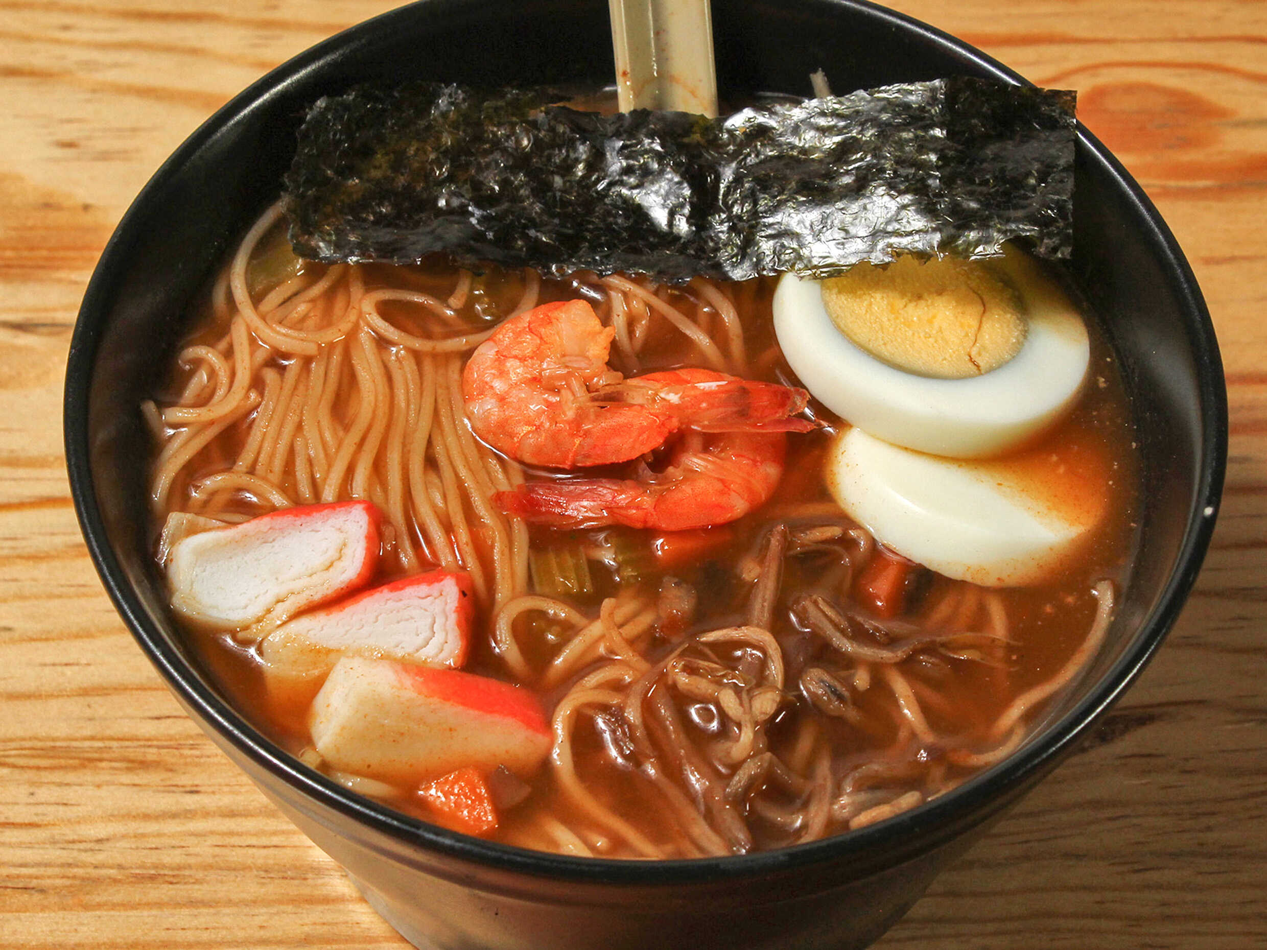 Fideos e trigo acompañados de camarón grande, tres piezas de camarón frito spam, col morada, alta y surimi