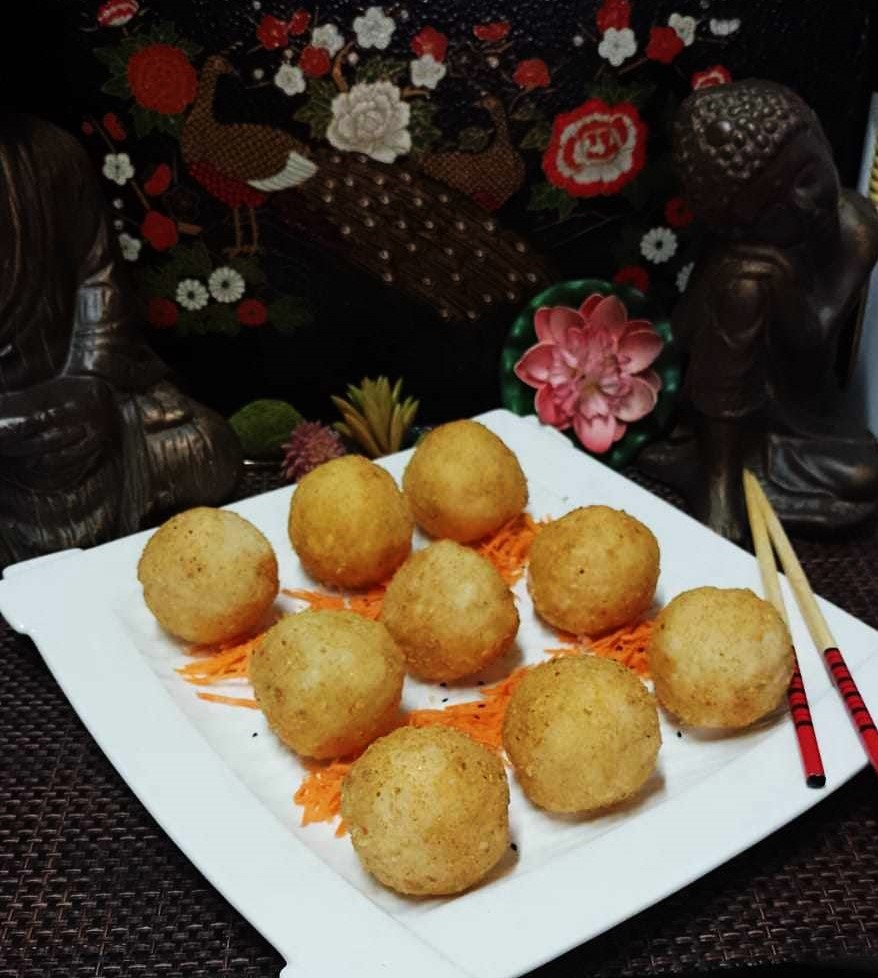 3 Bolas rellenas de pollo, 3 bolas rellenas de cerdo y 3 bolas rellenas de surimi.