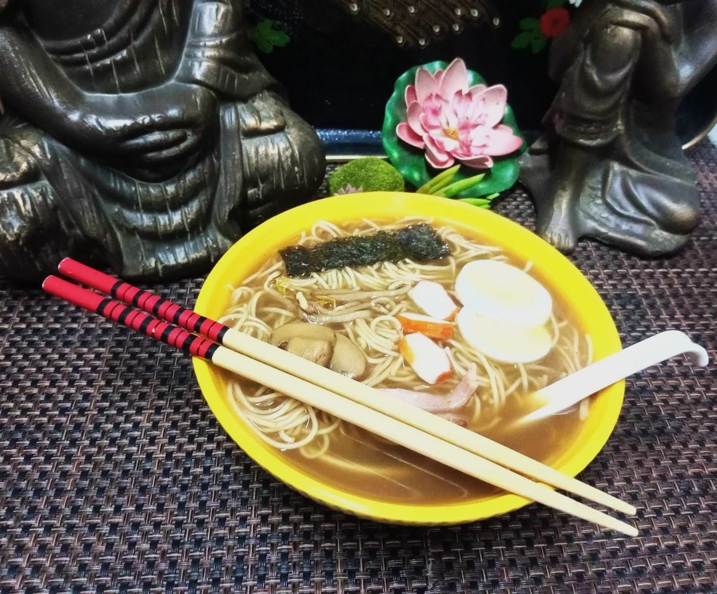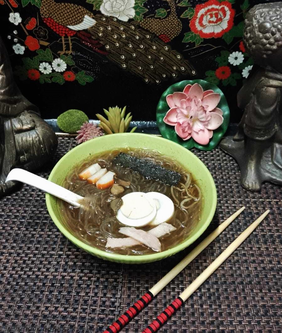 Fideos trigo acompañados de tres gyosas de carne,surimi, espinacas, naruto
