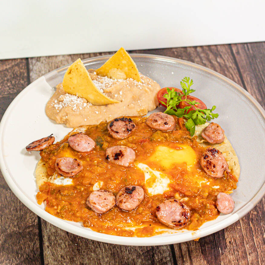 2 Huevos montados sobre tortilla frita, bañados con nuestra salsa majada picosita y con salchicha argentina, acompañados de frijoles.