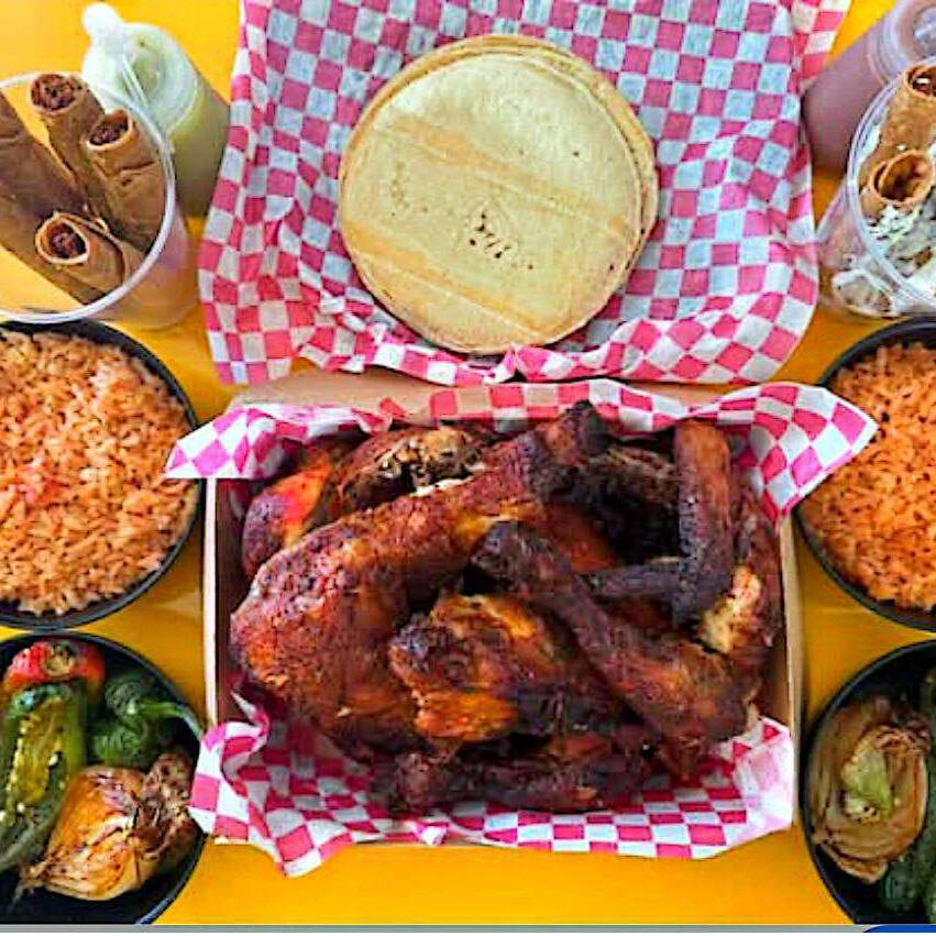 1 POLLO COMPLETO + ARROZ + SALSAS + TORTILLAS + CHILE TOREADO + CEBOLLITAS + ELOTITO