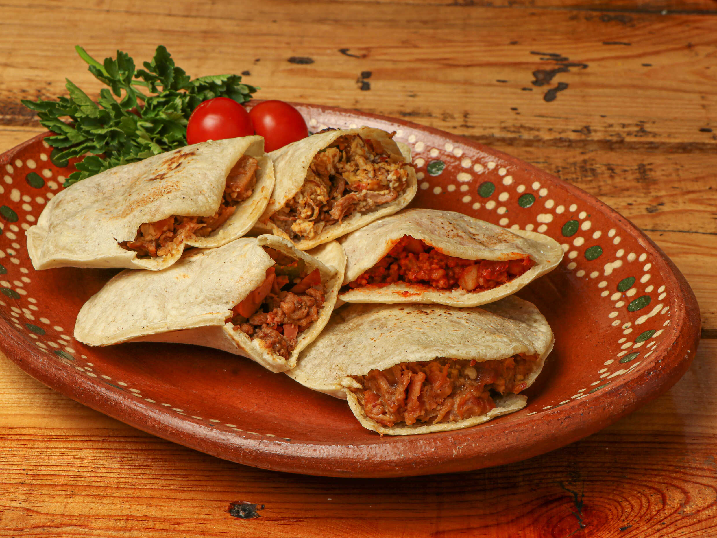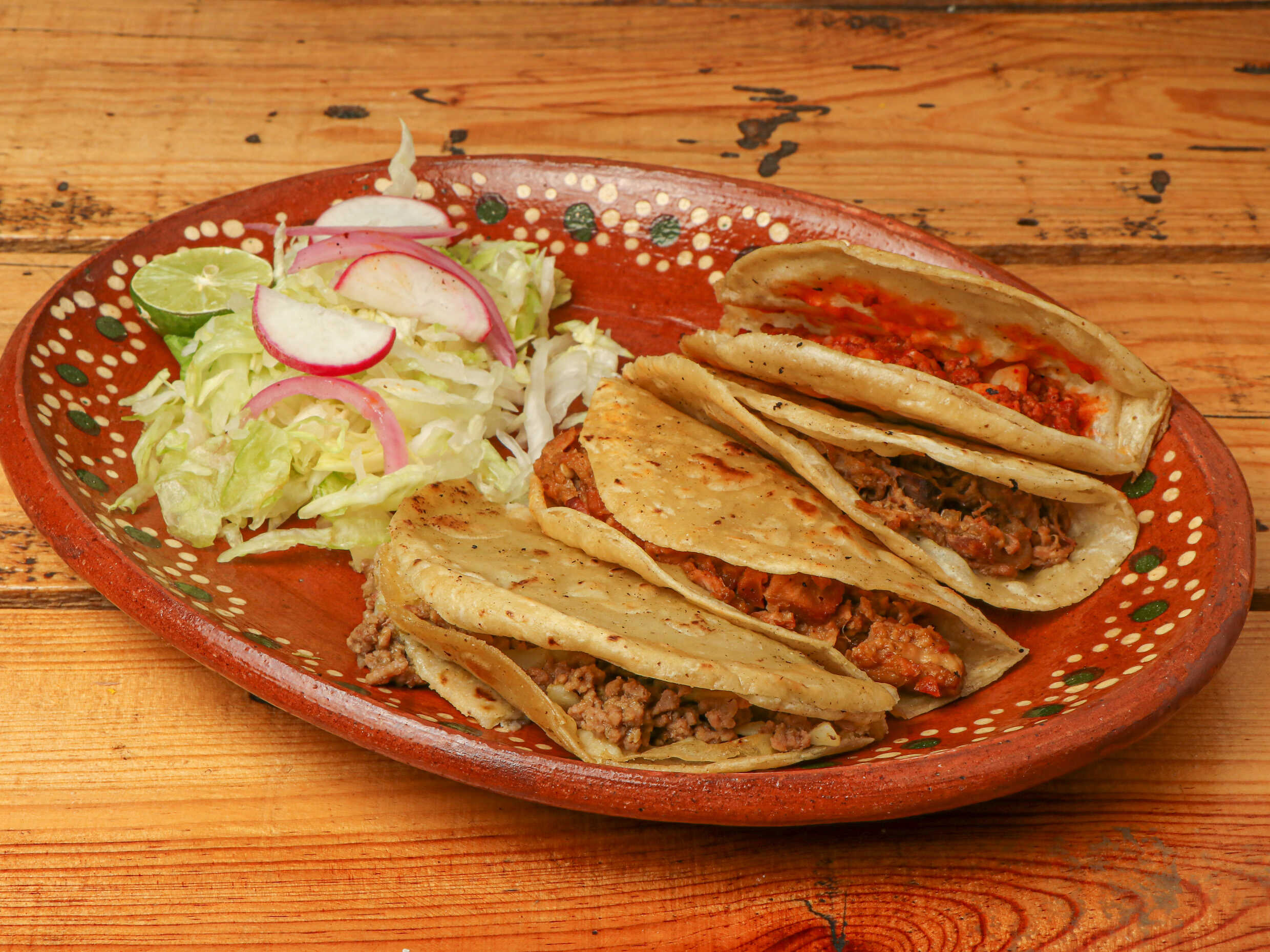 4 tacos Rancheros incluye verdura y salsa + Agua de sabor. Elige tus guisos preferidos.