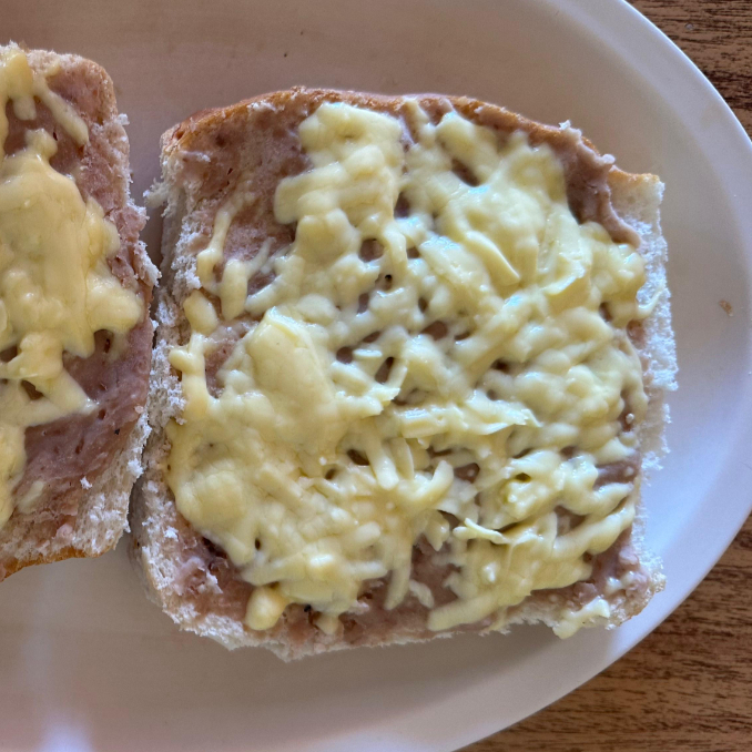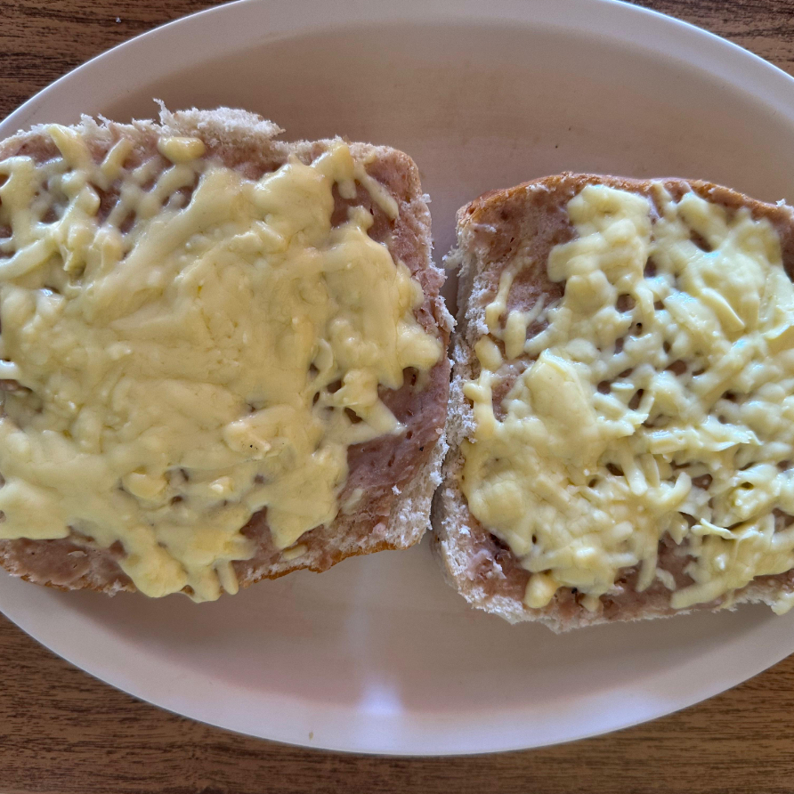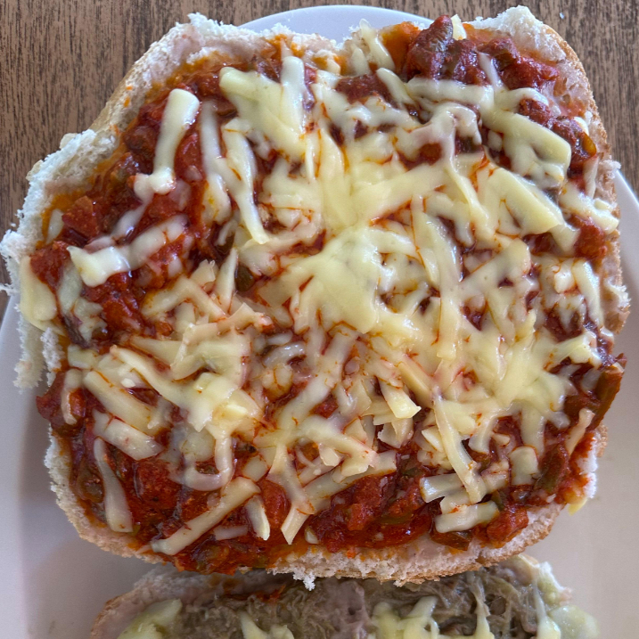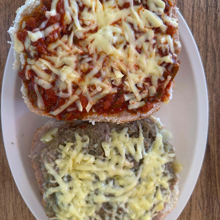 Mitad de pan artesanal con una cama de frijoles refritos y queso